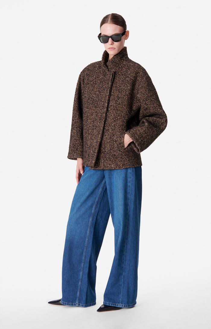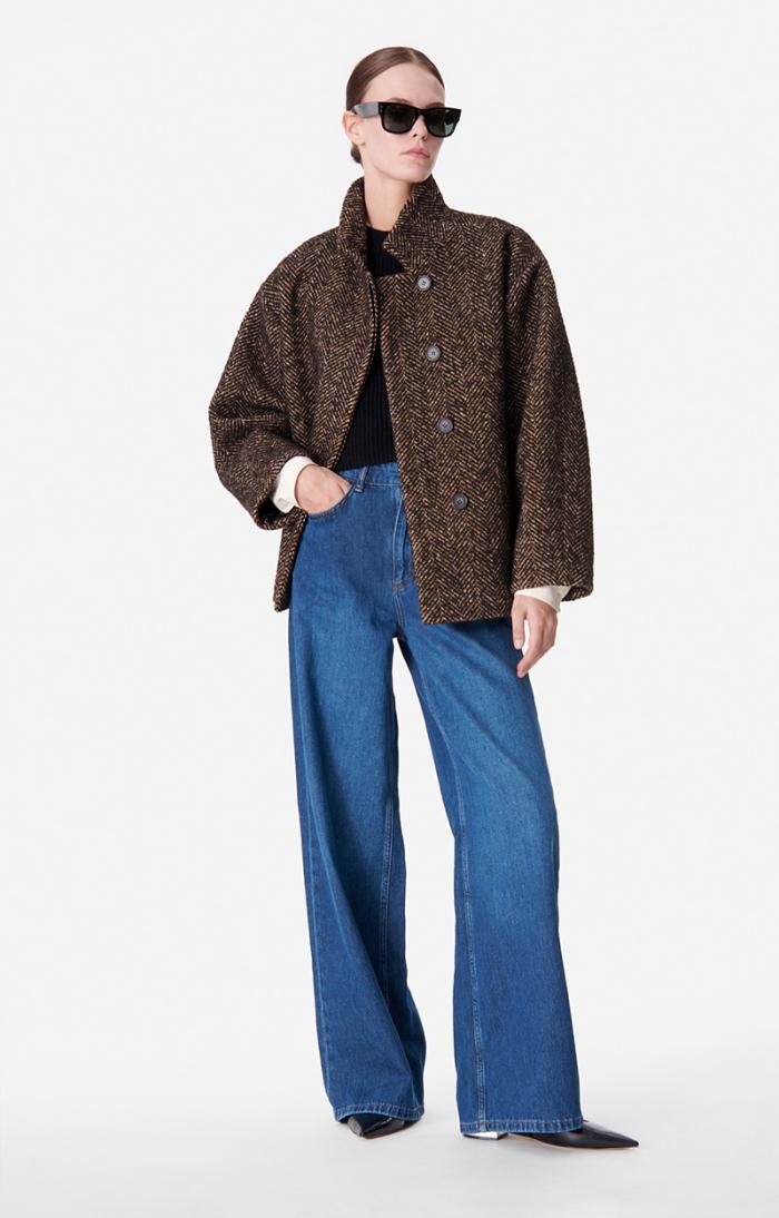 Introducing the Bentley mid-length coat for Autumn/Winter 2023, featuring contemporary oversized silhouettes with rounded lines that create a sophisticated preppy aesthetic. This tweed-effect design offers versatile styling with a convertible collar that adjusts to your preference. Perfect for pairing with mini skirts or flared jeans to create standout seasonal looks.