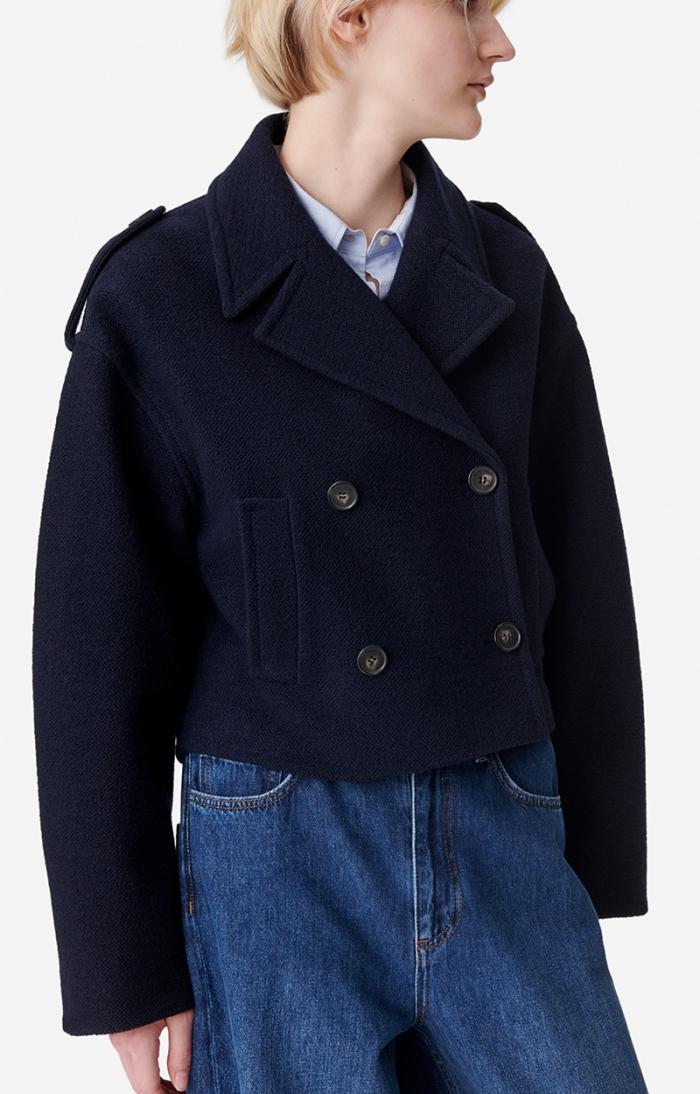 Meet the Beran peacoat, the perfect addition to your autumn-winter 2023 wardrobe. This chic cropped coat features a contemporary ball-shape silhouette crafted from premium cotton and wool blend, offering both style and warmth for a sophisticated urban look.