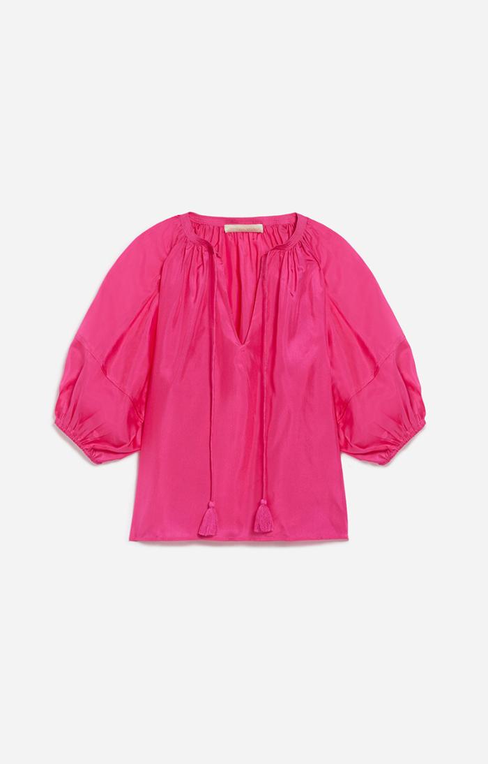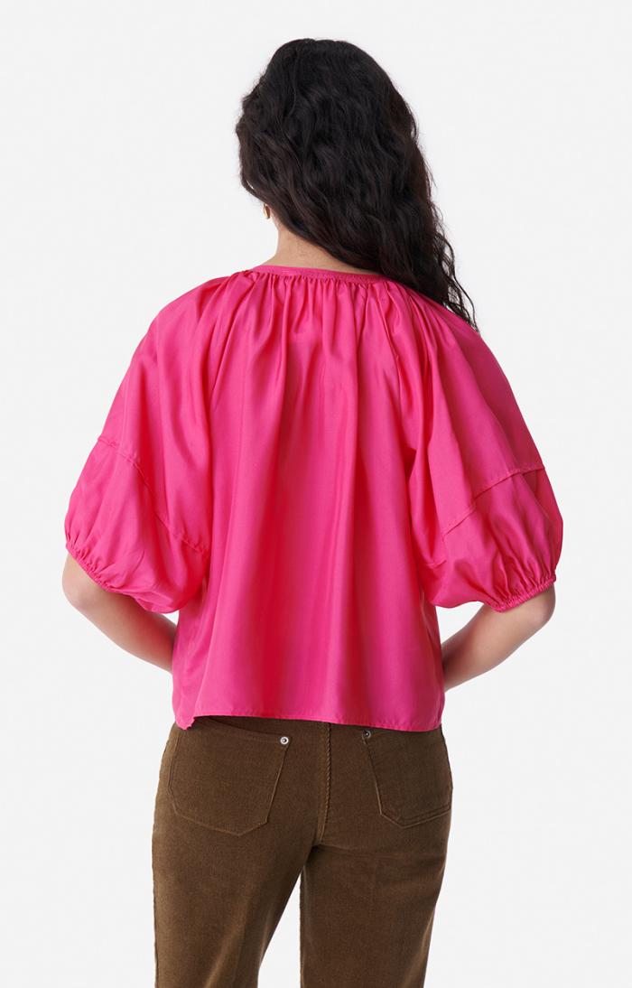 Experience the luxurious feel of a silk blouse that combines effortless elegance with bohemian charm. This beautifully designed top features a flattering oversized silhouette with a Henley neckline accented by statement-making pompom ties. The mid-length puff sleeves add a touch of romantic flair, while the elasticated cuffs with smocking details ensure perfect comfort. Delicate ruching at the collar completes this must-have piece that effortlessly elevates any wardrobe.