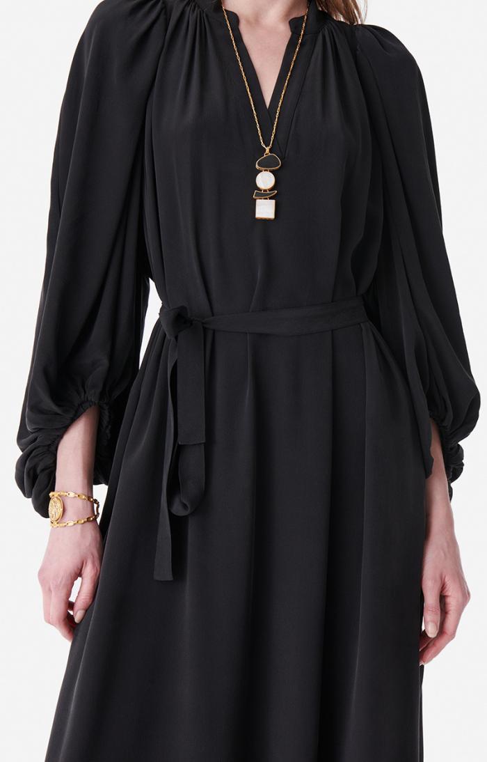 Elevate your seasonal wardrobe with the stunning Canessa dress, featuring graceful flowing silhouettes and statement puffed sleeves perfect for any special occasion. Crafted from luxurious silk, this sophisticated V-neck design offers versatile styling options with its cinchable waist feature.