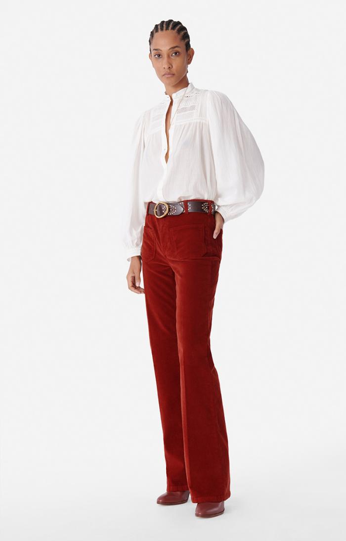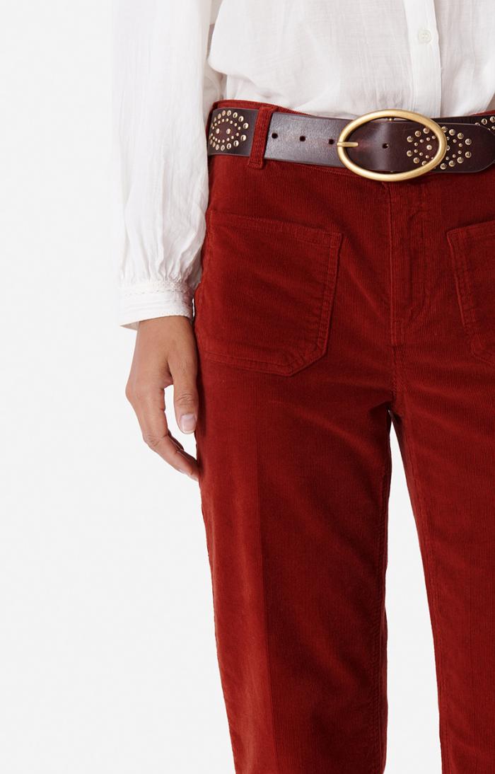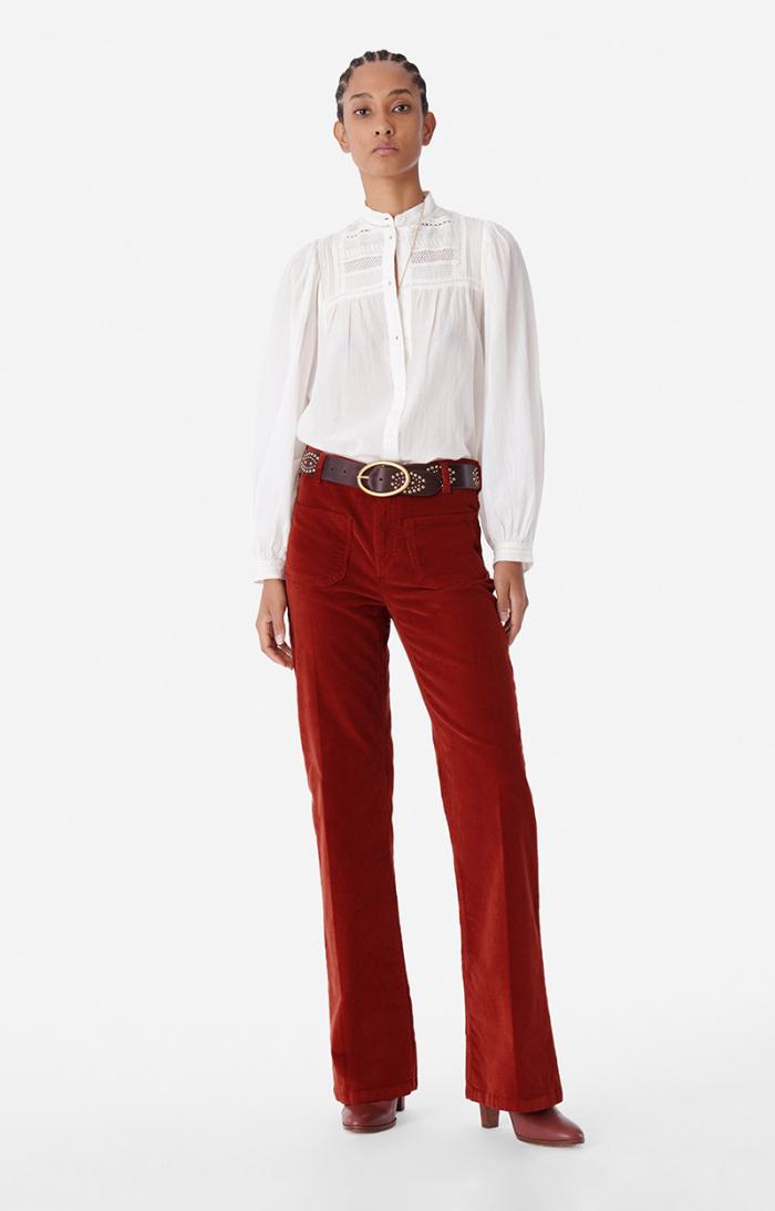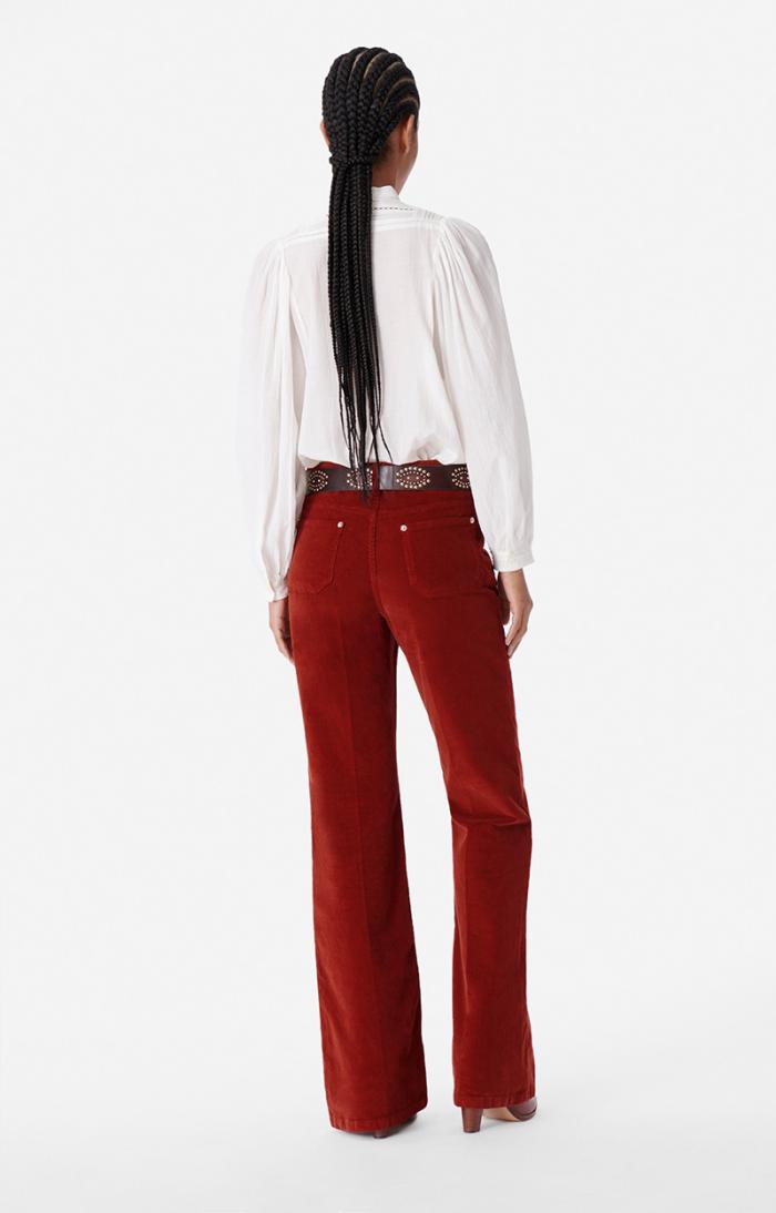 A timeless Vanessa Bruno classic, the Dompay trousers feature a fresh seasonal update in premium corduroy that combines sophisticated elegance with everyday versatility. These pants maintain the signature high waist, flared silhouette, and enduring style that make them a wardrobe essential—perfect for dressing up with ankle boots or keeping casual with your favorite sneakers.