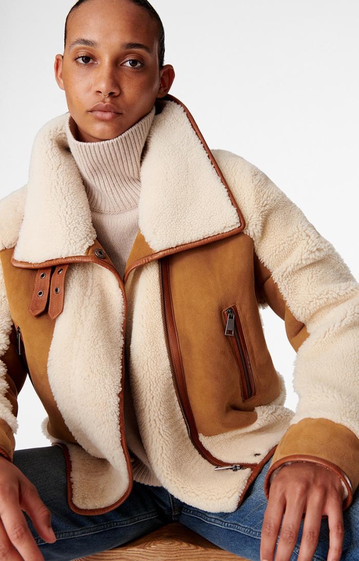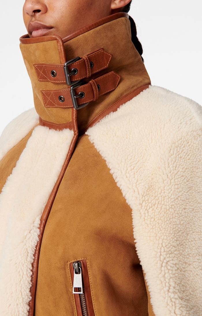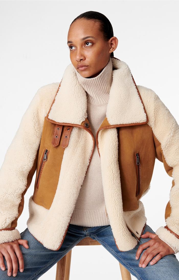 Experience luxurious comfort with this elegant shearling Manila jacket featuring long sleeves and a sophisticated high collar. Two convenient zip pockets on each side provide practical storage. Beautifully contrasted sleeves, collar, and bottom hem create striking visual appeal. Model is 178cm / 5’10” and is wearing a FR S.