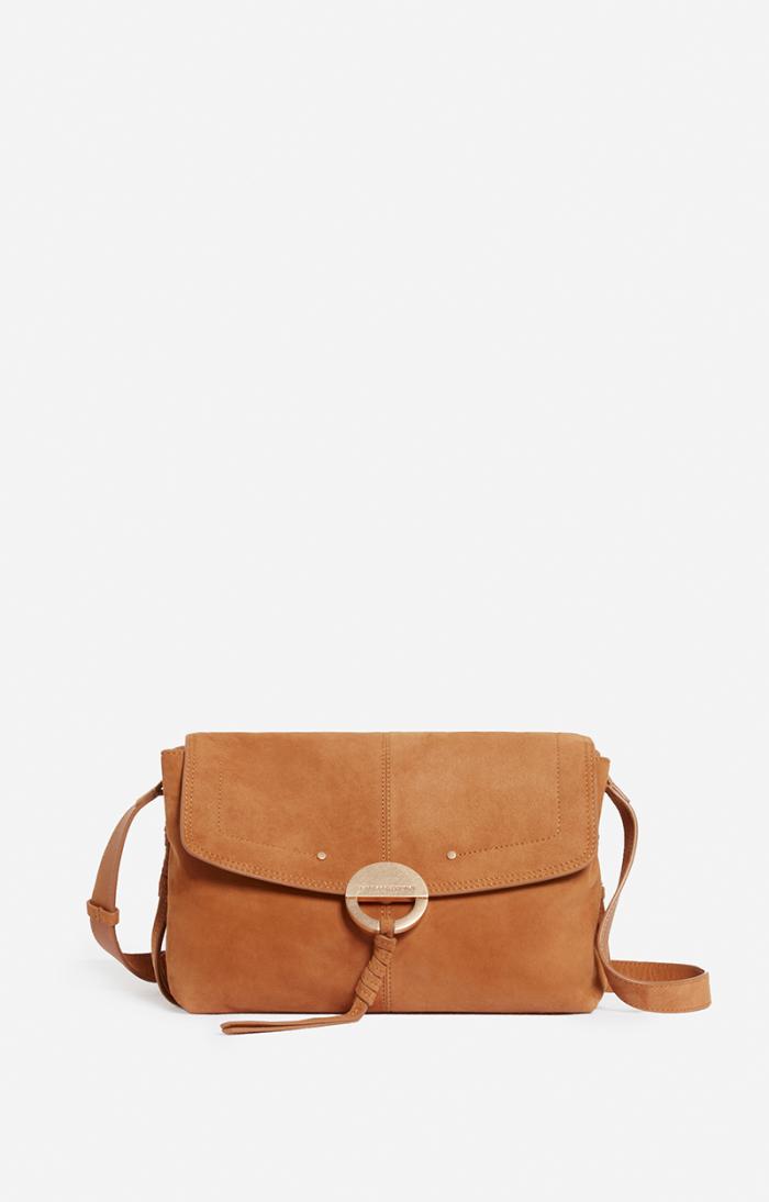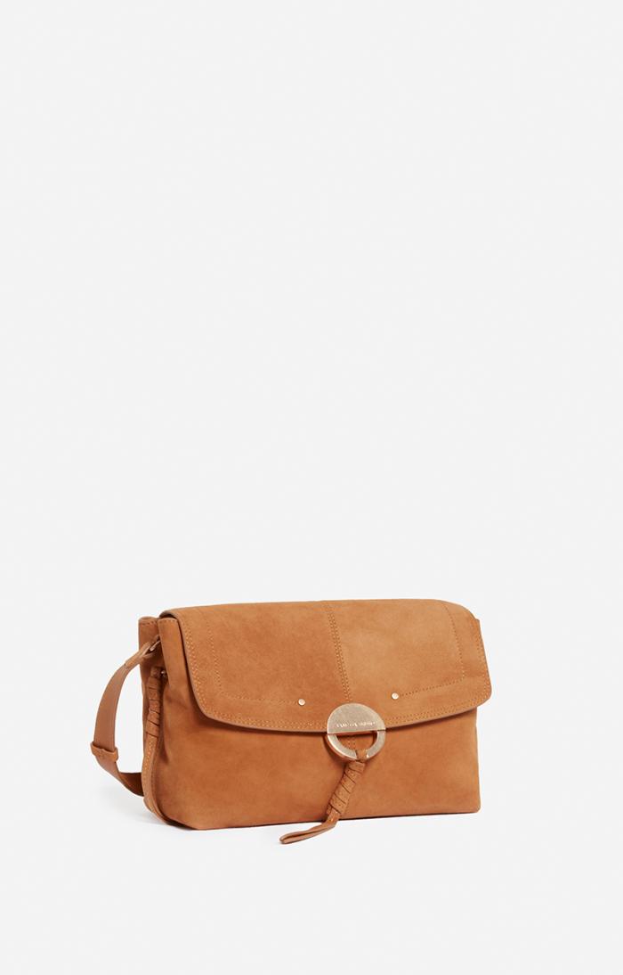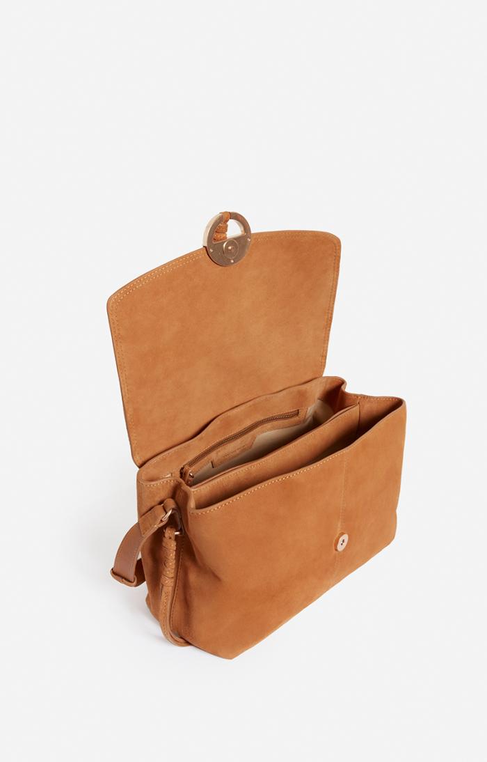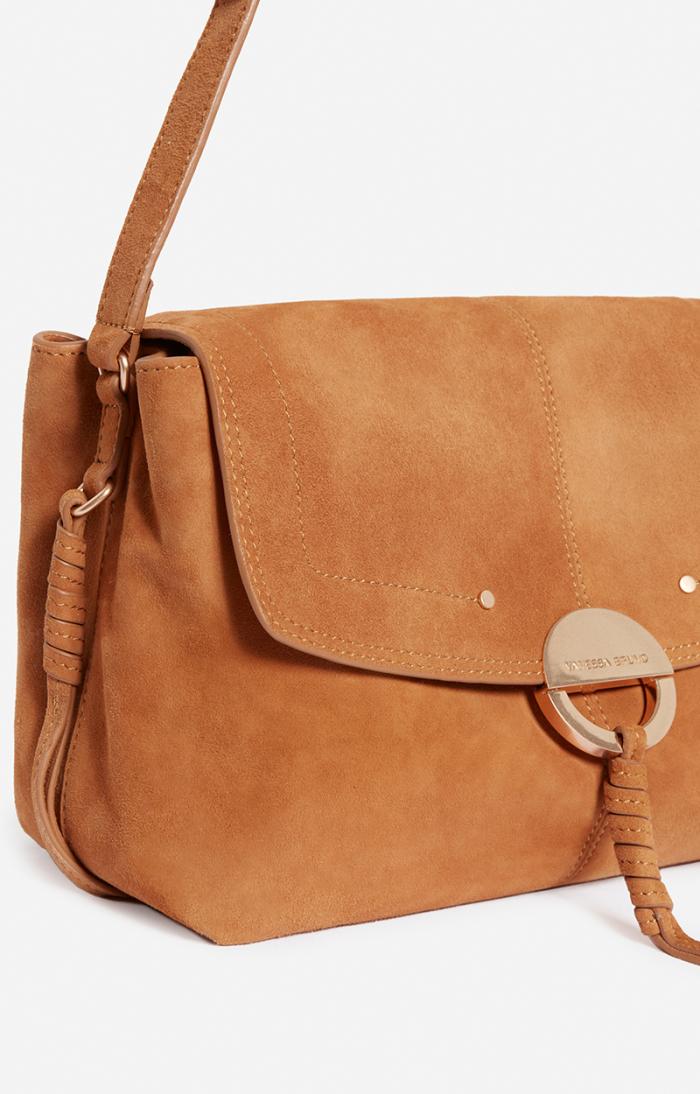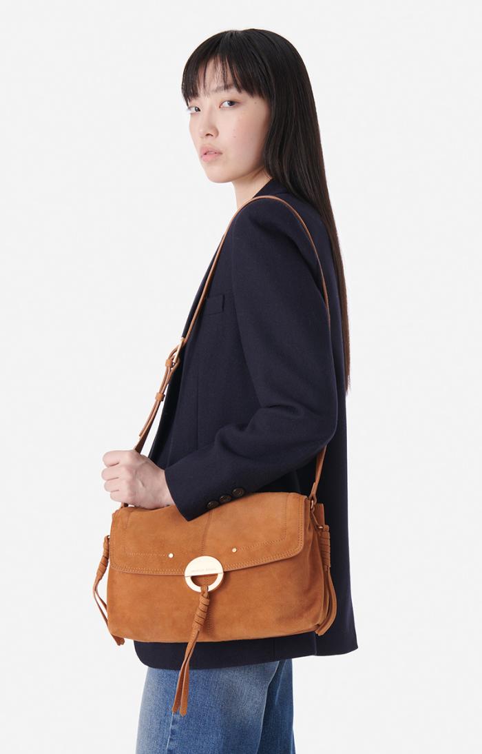 Adjustable suede and leather handle with gold buckle for carrying on the shoulder and across the body.