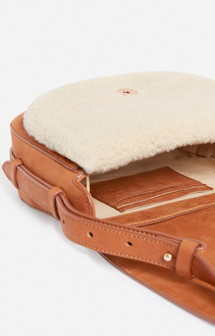 Introducing the sophisticated Othilia flap bag, expertly designed to combine elegant style with practical functionality. Featuring two secure flaps, this streamlined design ensures your essentials stay perfectly organized and protected. Crafted in luxurious nubuck leather with cozy shearling accents, this bag creates a beautiful contrast perfect for fall and winter seasons.