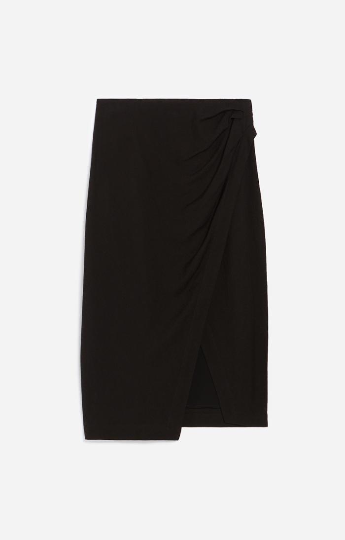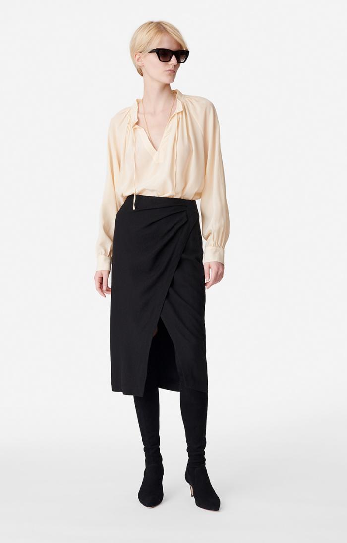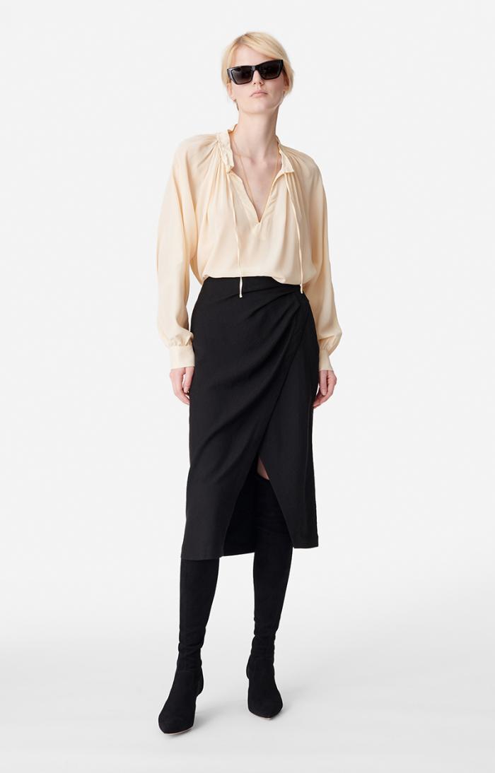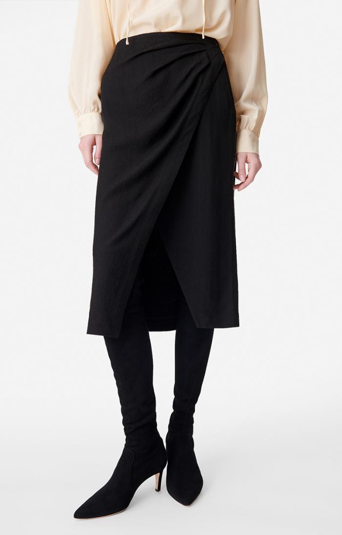 Experience timeless sophistication with the iconic Vannie skirt from Vanessa Bruno. Crafted in a premium linen blend, this midi-length design features an elegant faux wrap silhouette, a dramatic side slit, and flattering pleated detailing at the hips. A wardrobe essential that combines Parisian elegance with everyday versatility.