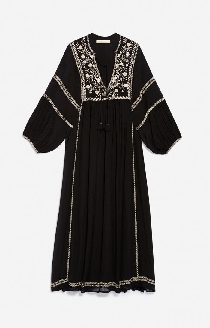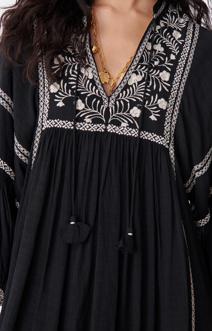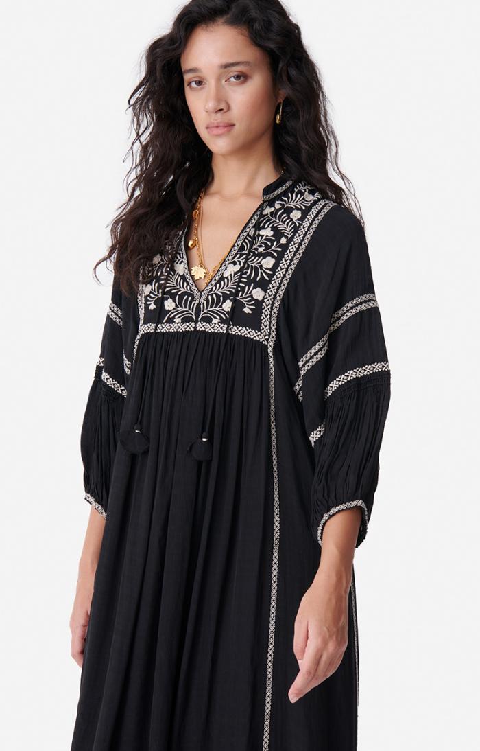 Experience timeless sophistication with the iconic Vanessa Bruno Veronica dress, crafted from lightweight sheer fabric with delicate patterning. This elegant flowing design showcases exquisite white-on-black embroidery at the deep V-neckline and beautifully gathered sleeves.