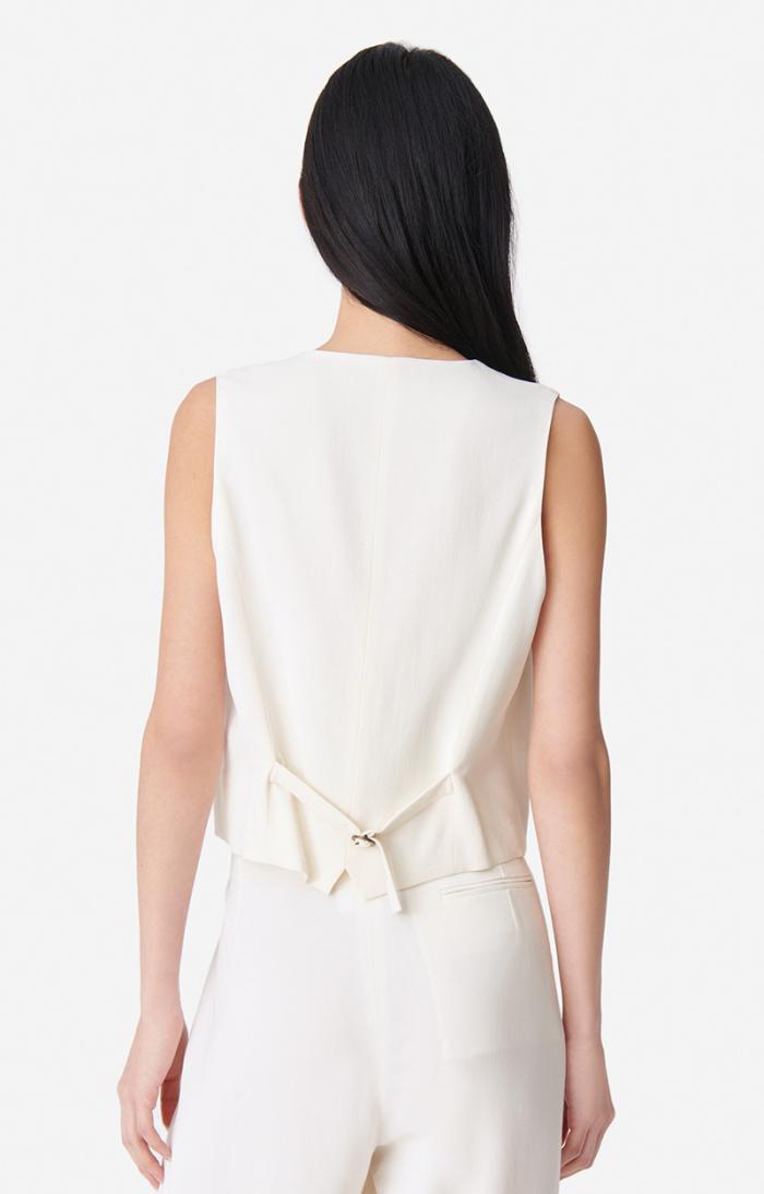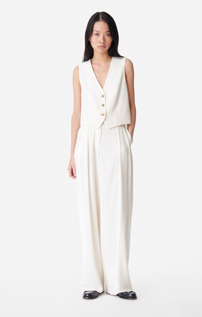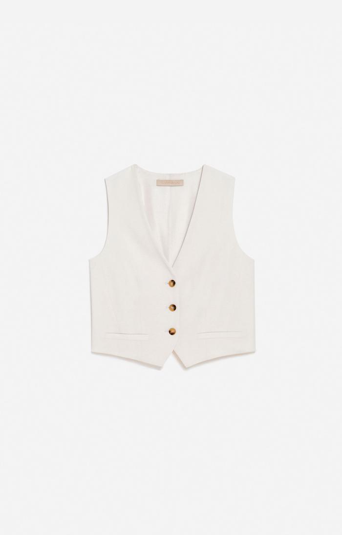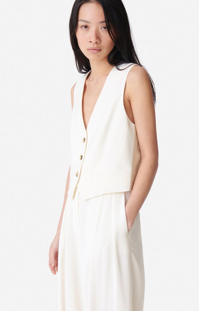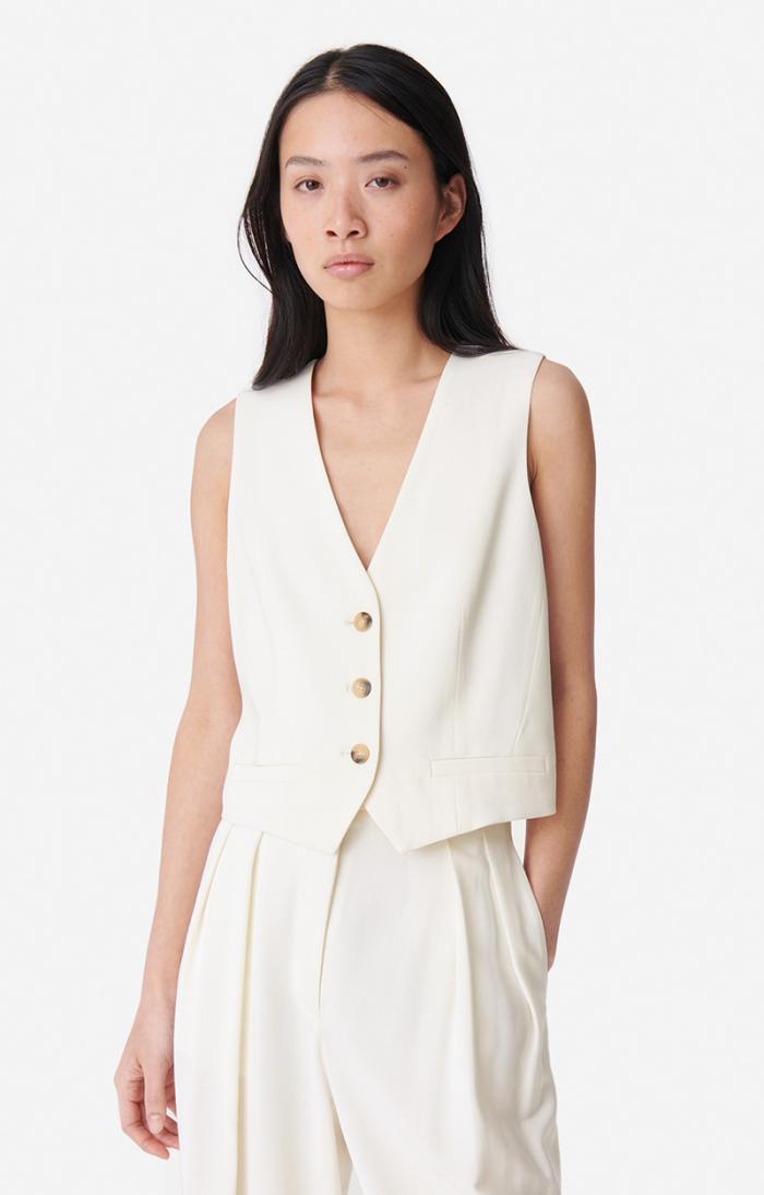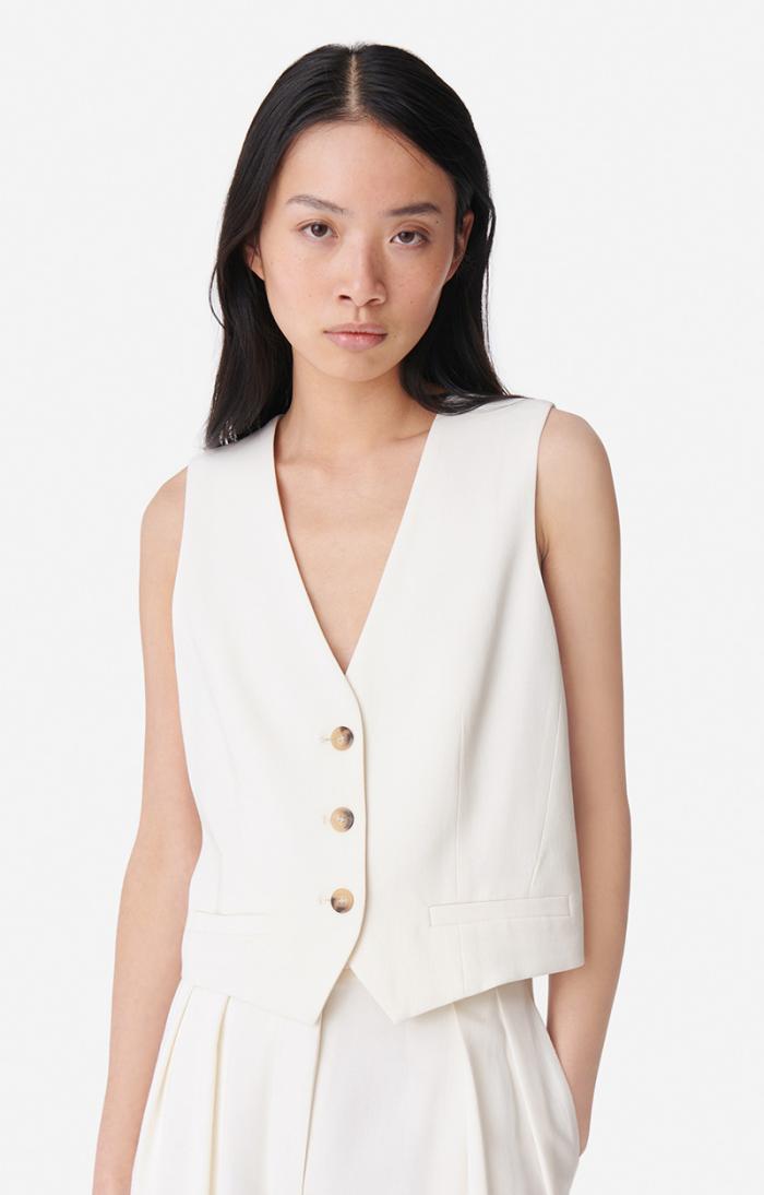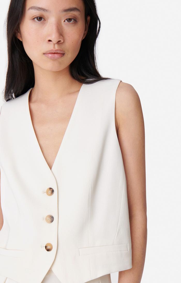 This sleeveless jacket with horn-style buttons plays on androgynous style, and has everything it takes to become the on-trend piece in this collection. Worn alone, with a crop top, or over a flowing shirt, the Benson jacket guarantees effortless elegance.