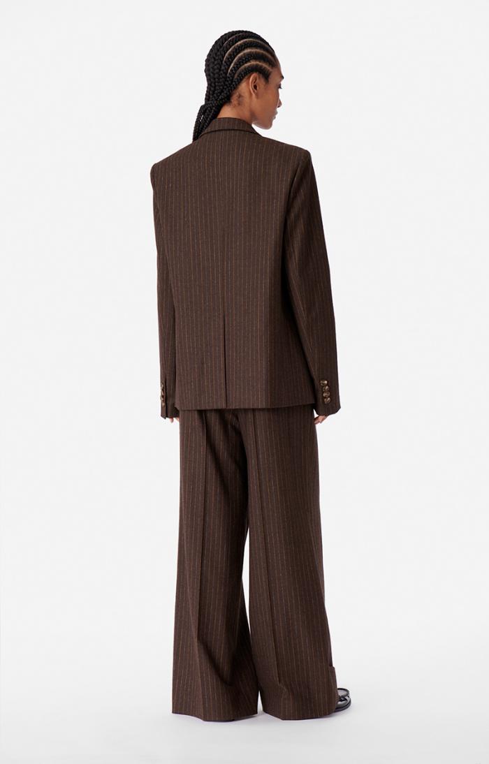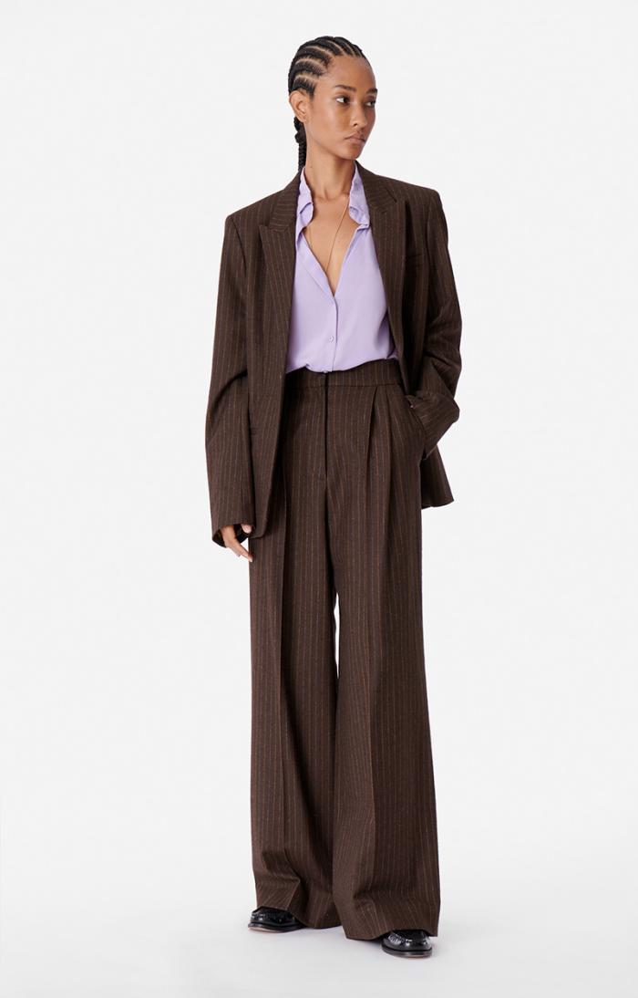 The Biguine blazer plays on the masculine styling so dear to Vanessa Bruno. Straight and with pronounced shoulders, this striped wool blend will add a cool yet sophisticated touch to your outfits. Wear it with the Ticiano trousers in the same fabric for a complete tailored look, or with jeans or a skirt.