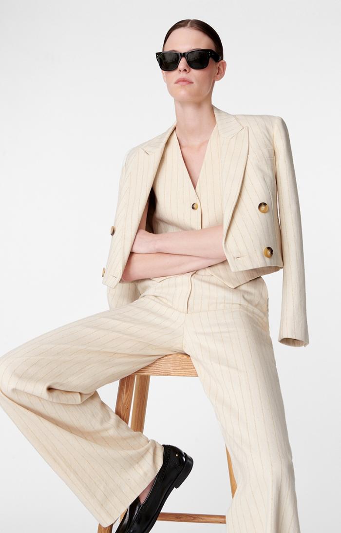 The Blaise blazer plays on men’s styling with its cropped cut and double-breasted buttoning. Made from striped cotton twill, this blazer can be worn with white jeans for a monochrome look, perfect for the office, or with linen trousers for summer.