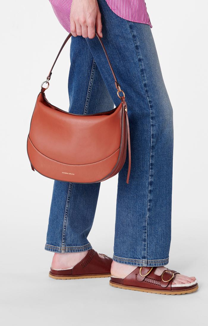 Smooth leather half-moon bag. Carried by hand, cross-body or on the shoulder.