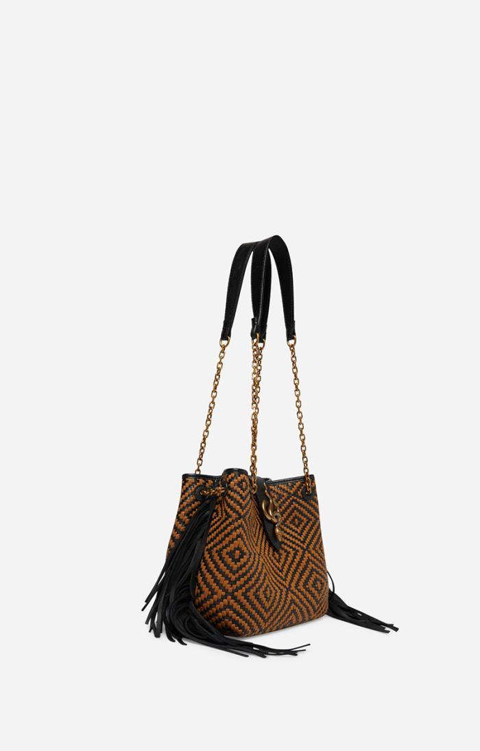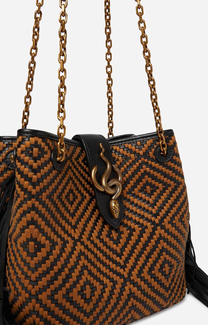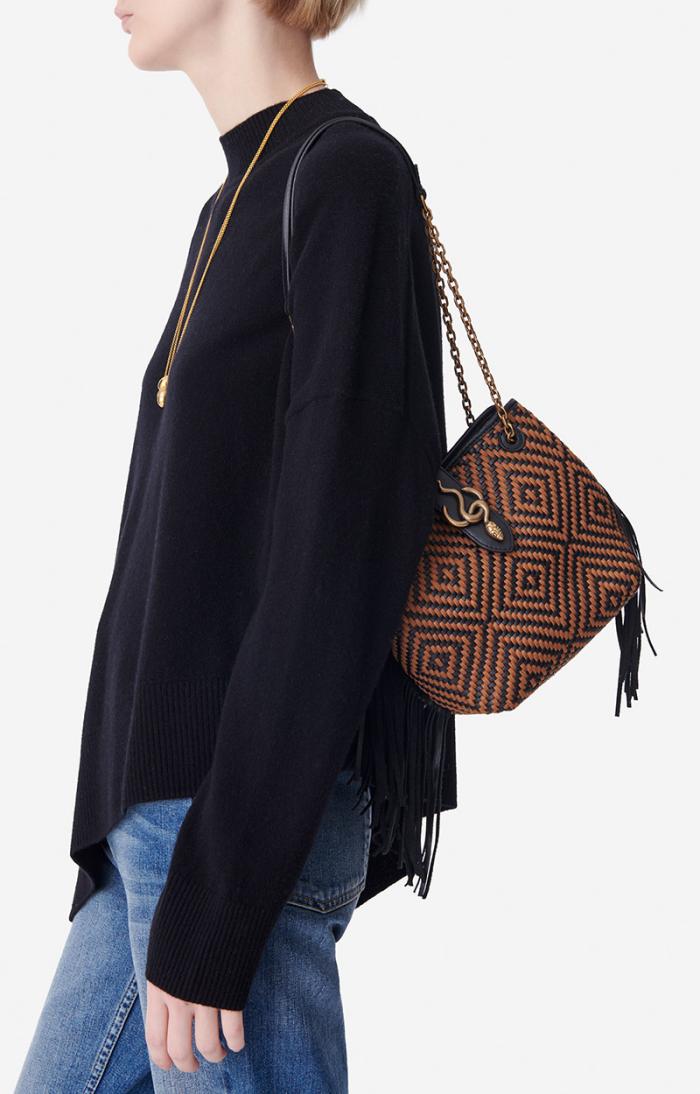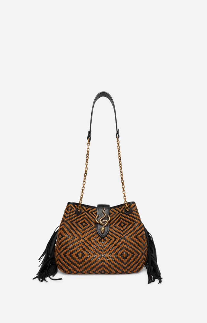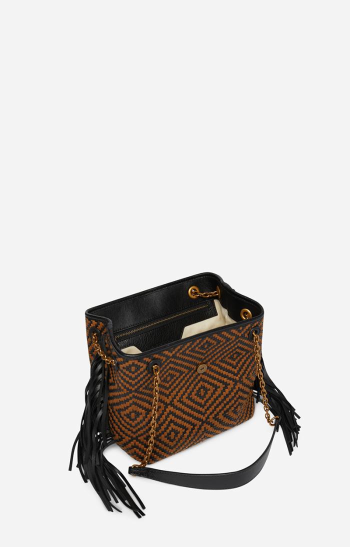 The little Cléo purse bag is both chic and bold. Crafted in a leather and cotton weave, this design is enhanced with a fringe and features the metal snake clasp. Turn heads!