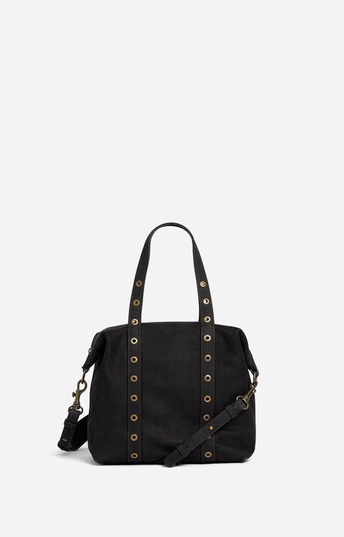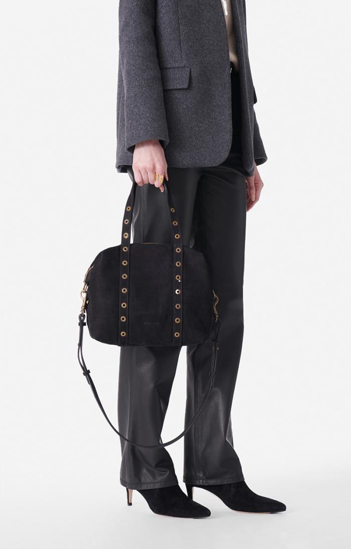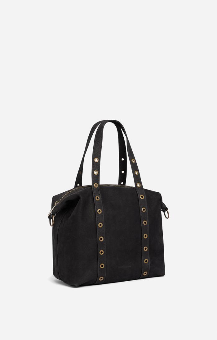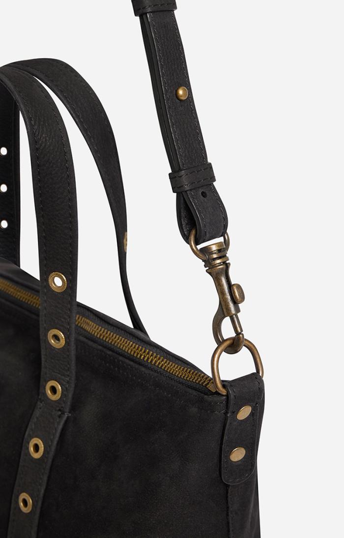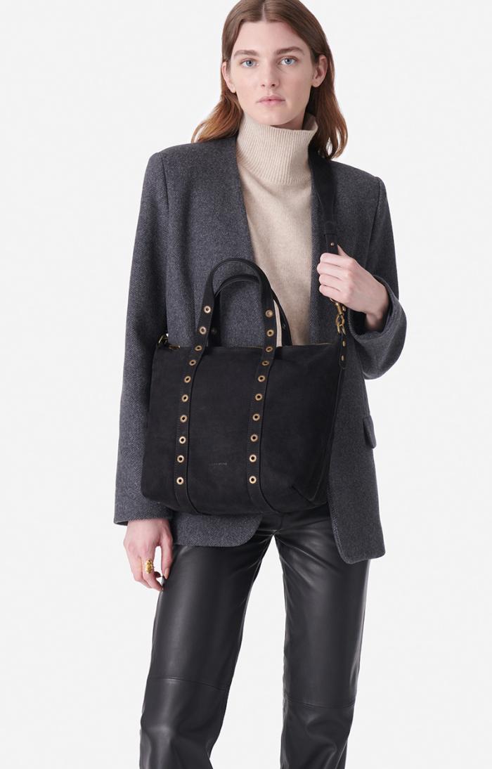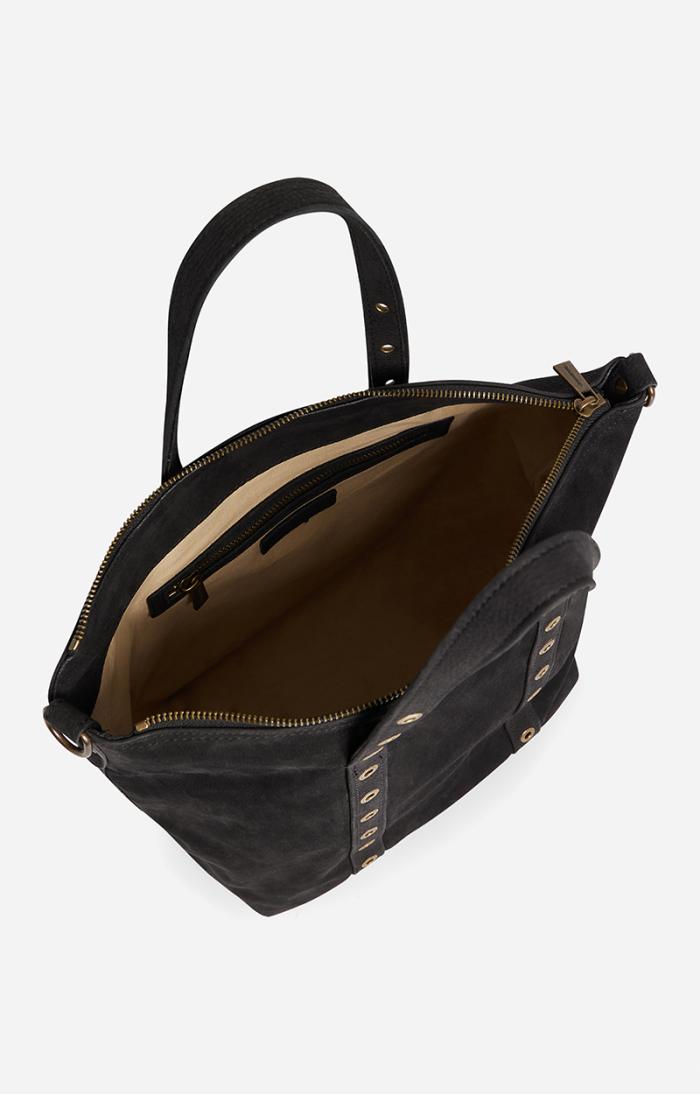 Small Zippy tote bag in suede leather, with two handles for carrying by hand and a removable strap for carrying on the shoulder.It has three pockets, including one with a zip inside and a removable luggage tag.There is a label made of natural plant leather inside, hot stamped with lettering “Vanessa Bruno made in Italy”.