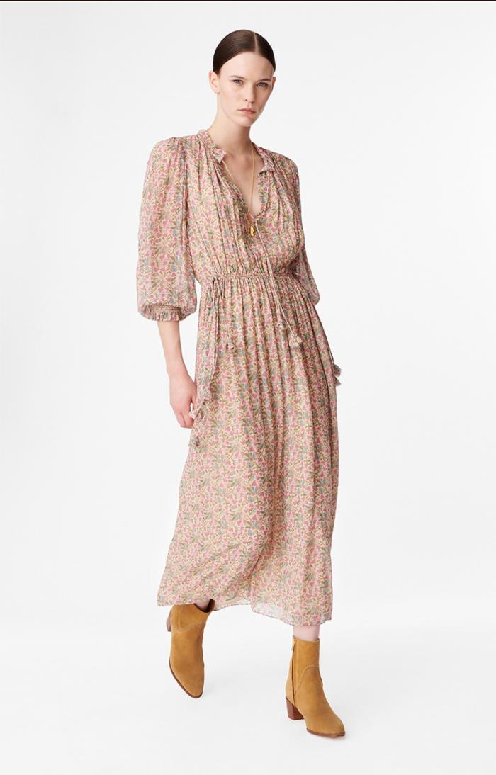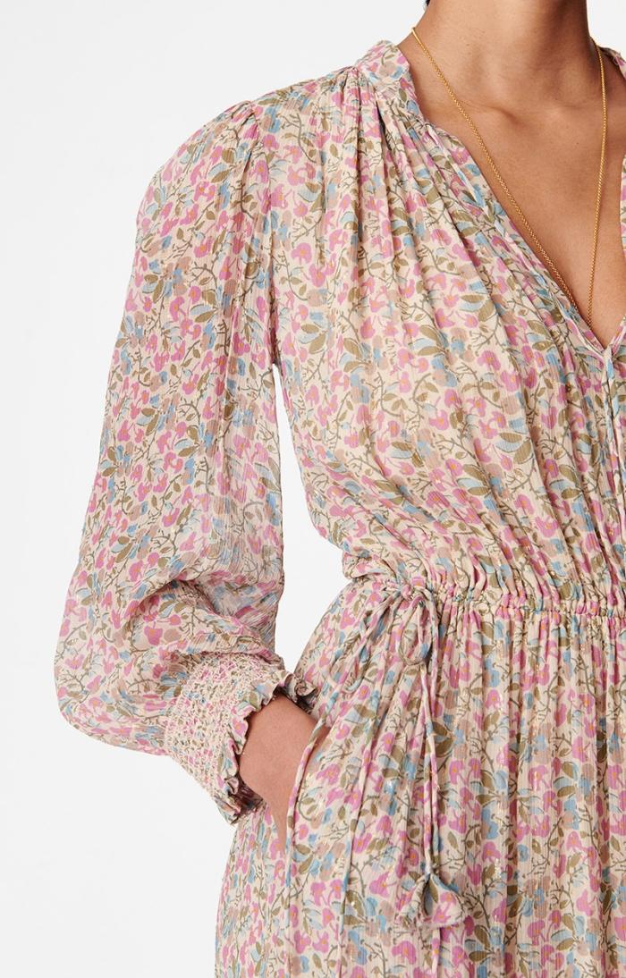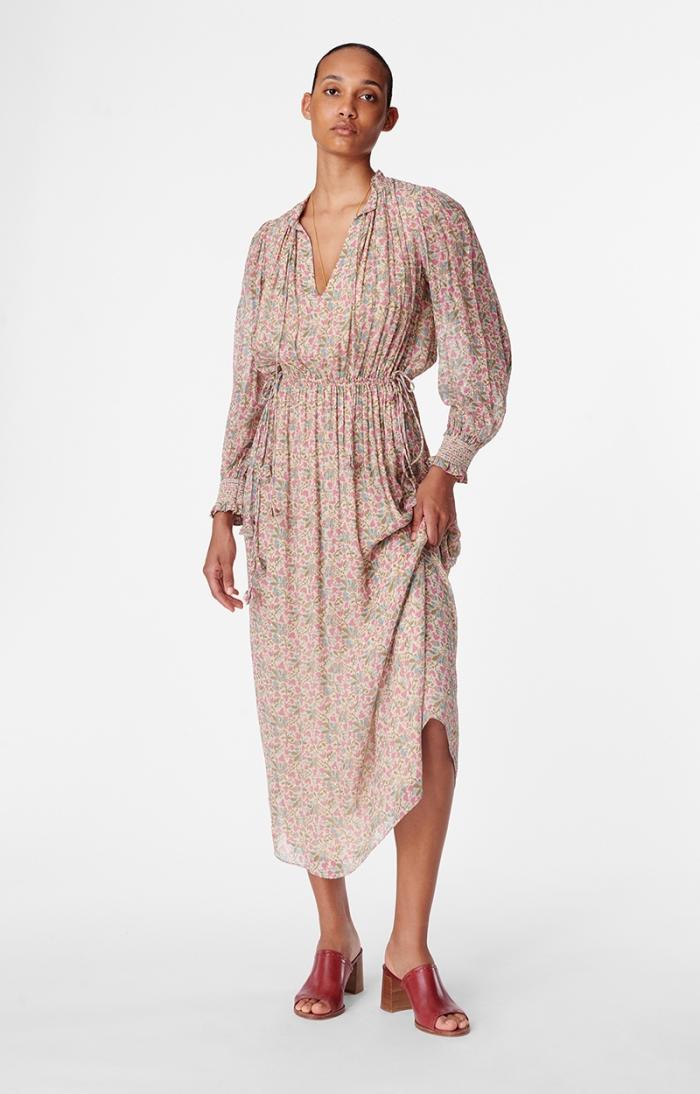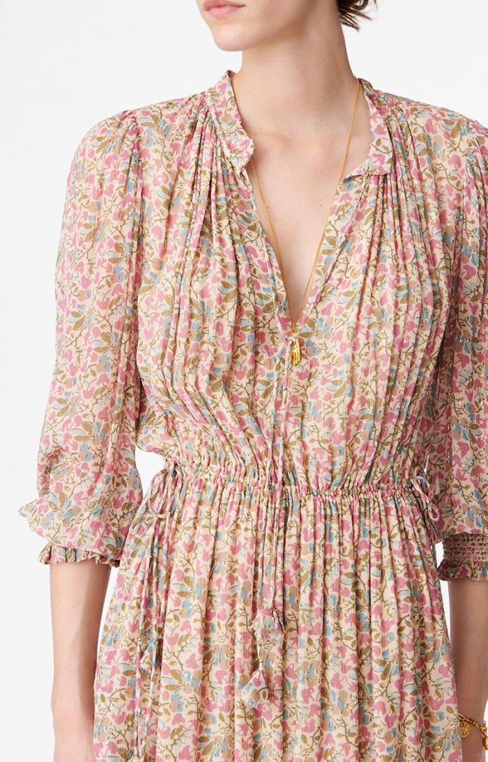 Bohemian and romantic, the Babeth dress stands out for its fluidity and gather work, with a drawstring detail and ties at the collar. The waist is marked by an elasticated tie at the sides. The ties are embellished with small fabric tassels.