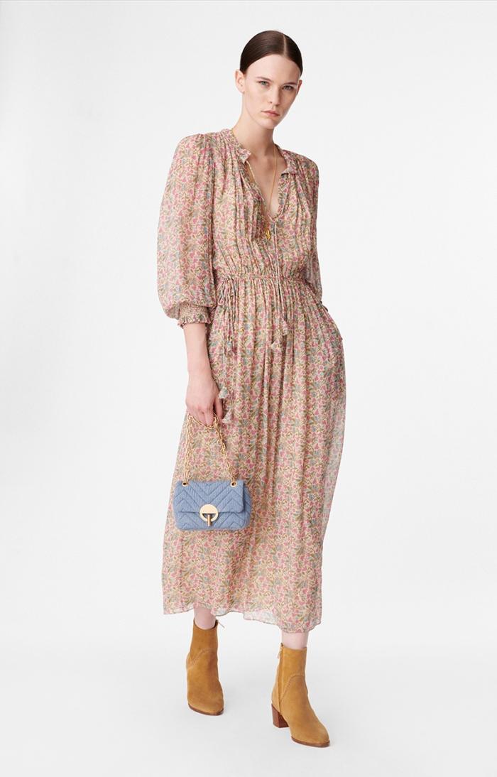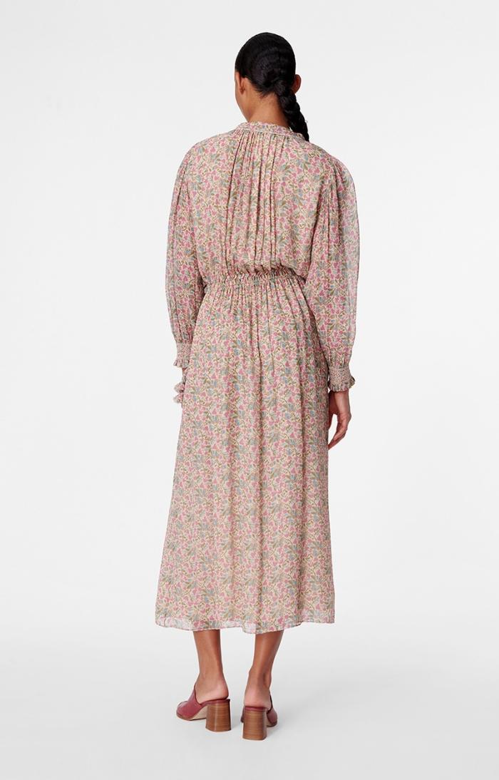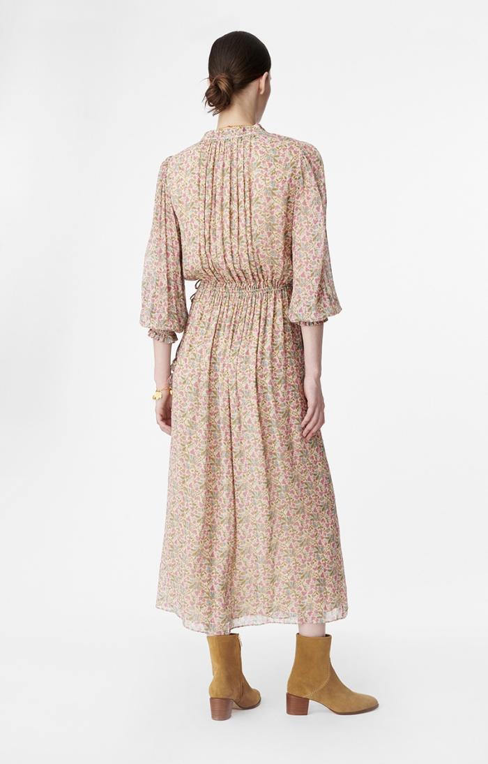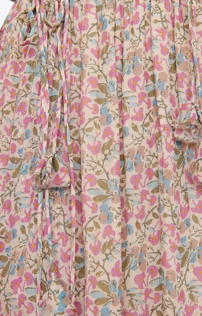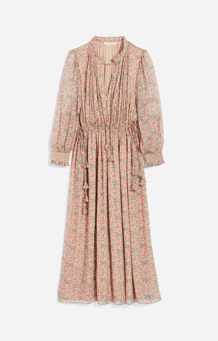 Bohemian and romantic, the Babeth dress stands out for its fluidity and gather work, with a drawstring detail and ties at the collar. The waist is marked by an elasticated tie at the sides. The ties are embellished with small fabric tassels.