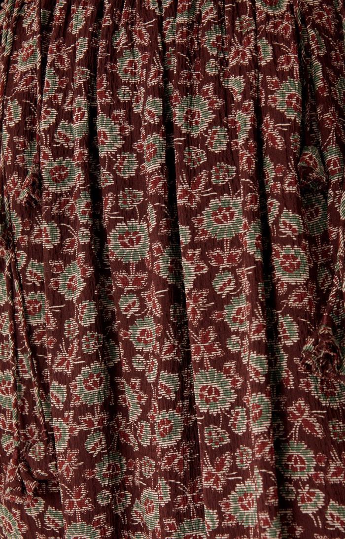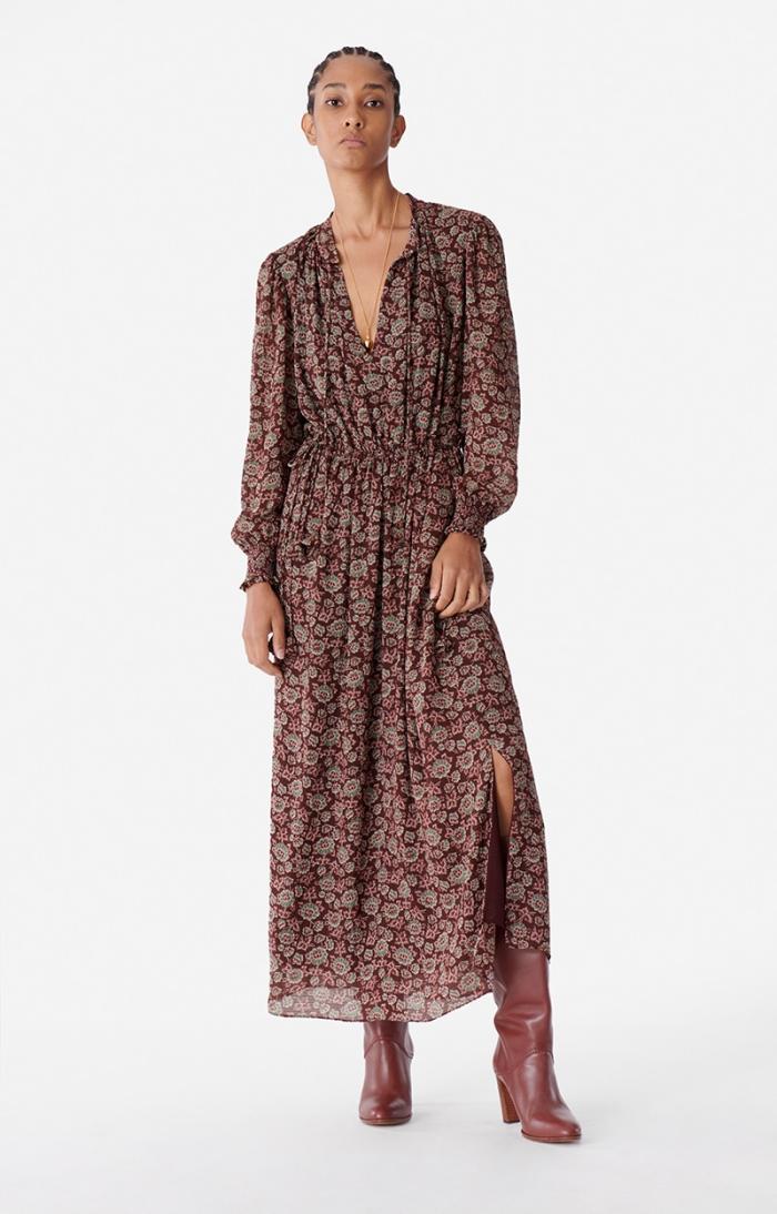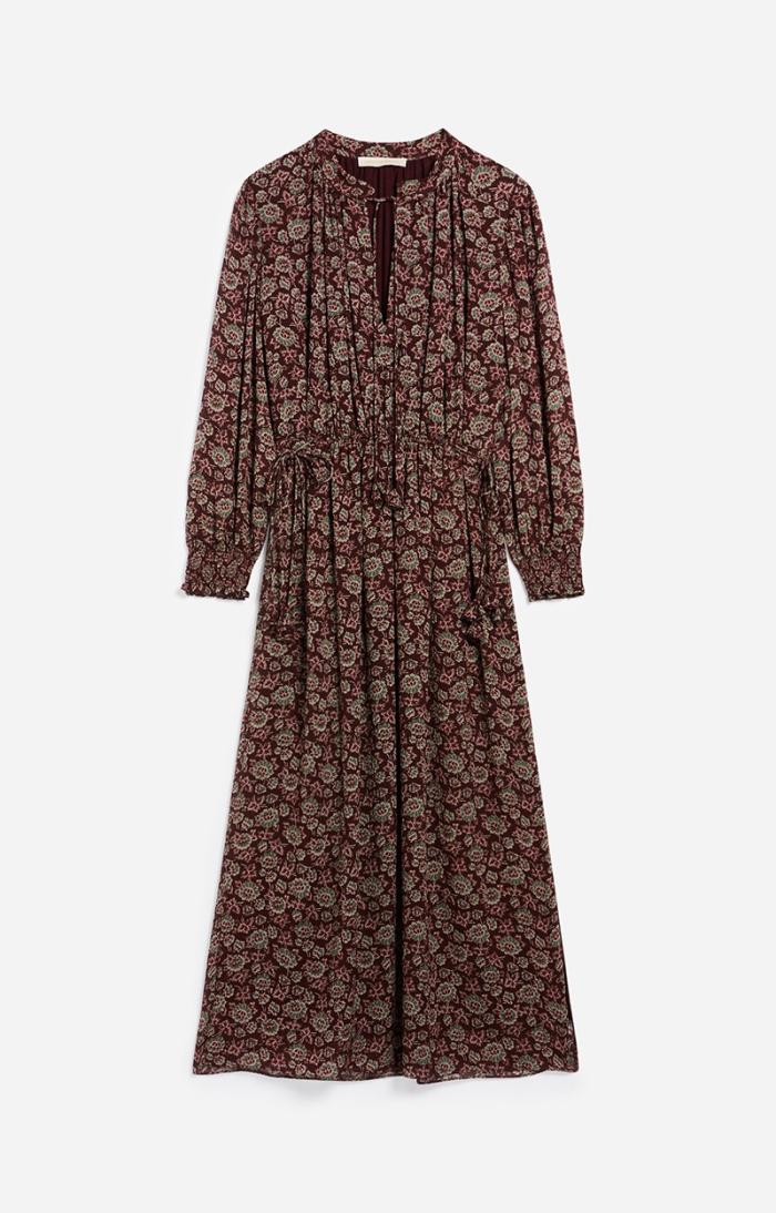 Bohemian and romantic, the silk blend Babeth dress stands out for its fluidity and gather work, with a drawstring detail and ties at the collar. The waist is marked by an elasticated tie at the sides. The ties are embellished with small fabric tassels.