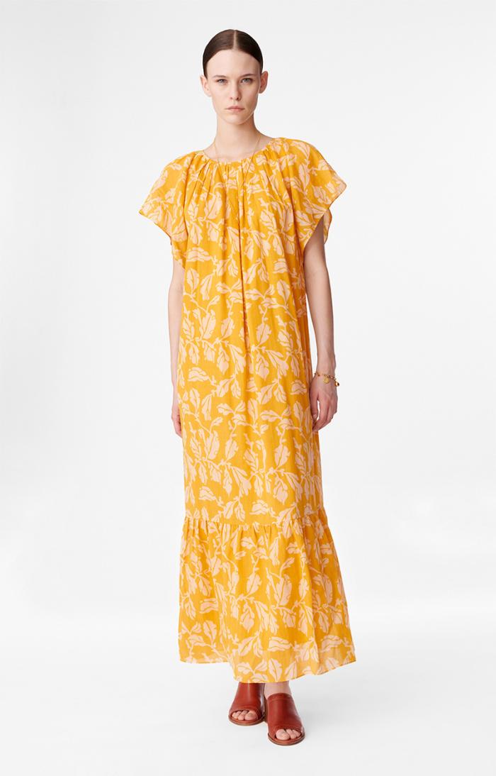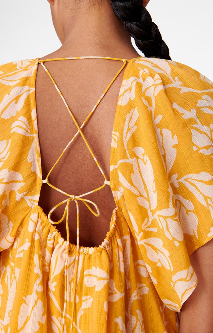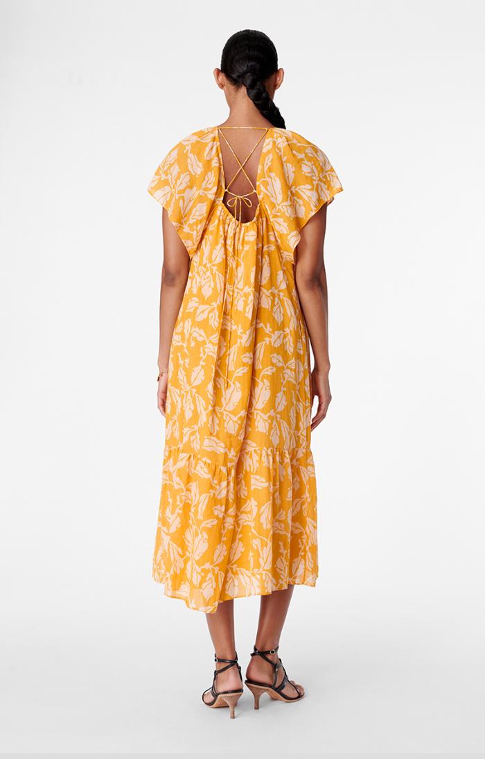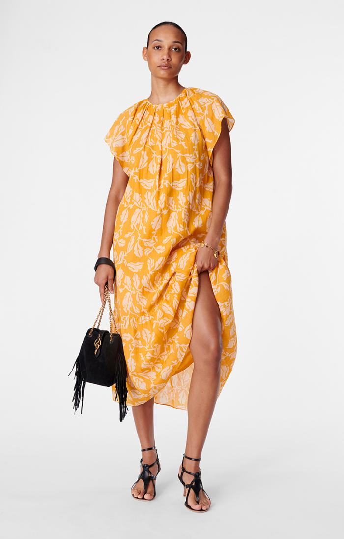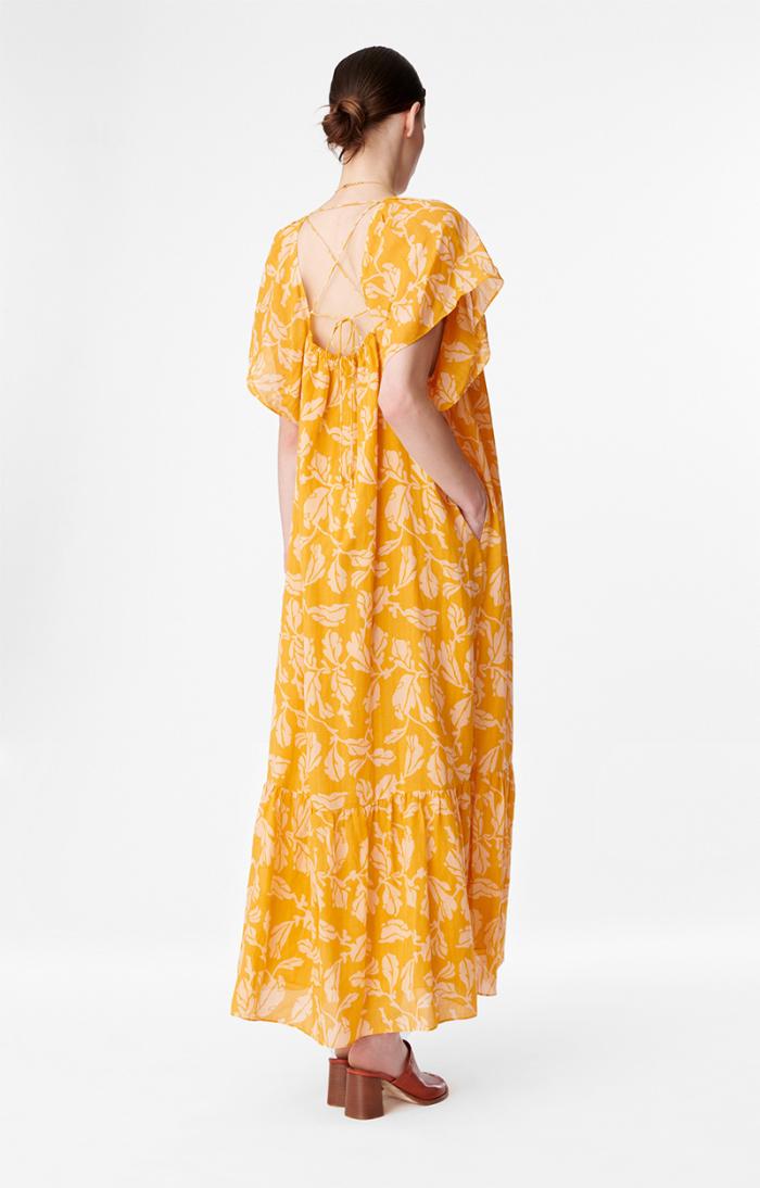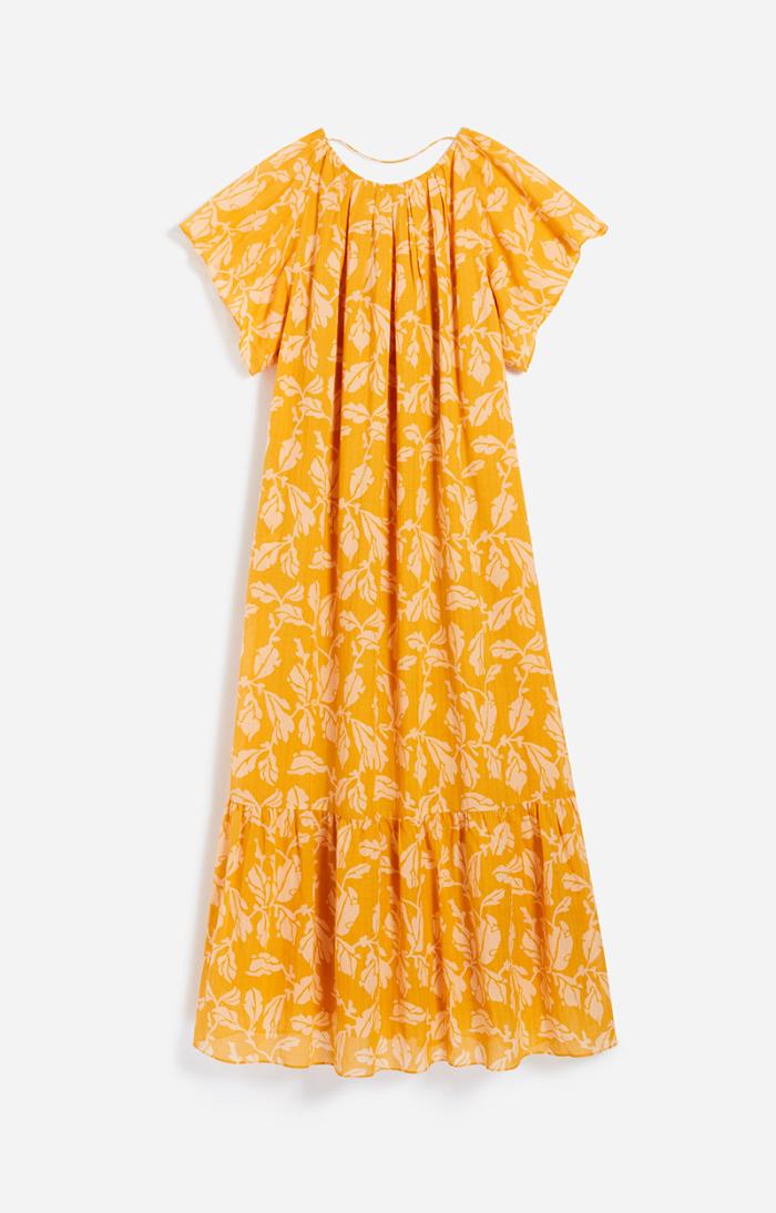 This dress stands out above all for its floral yellow print and open back, embellished with ties that you can adjust as you wish. The Balla dress, in cotton blend, is slightly sheer and ideal for summer evenings.