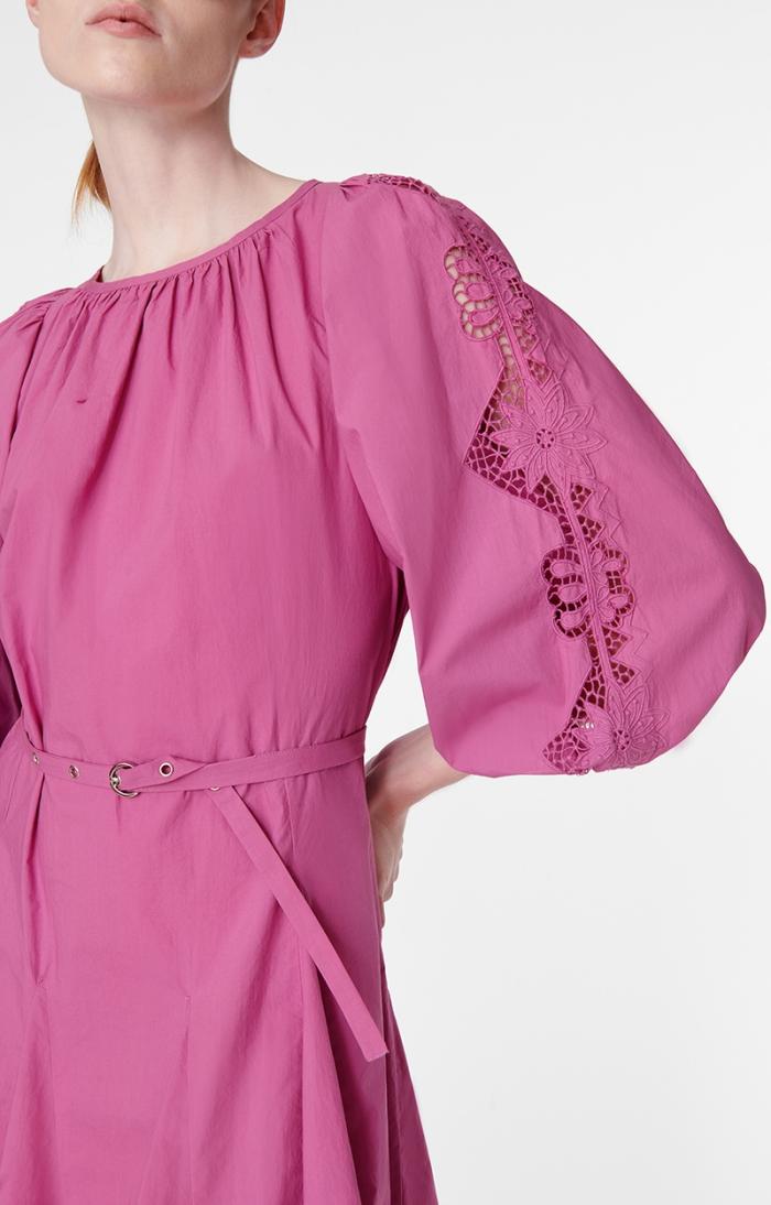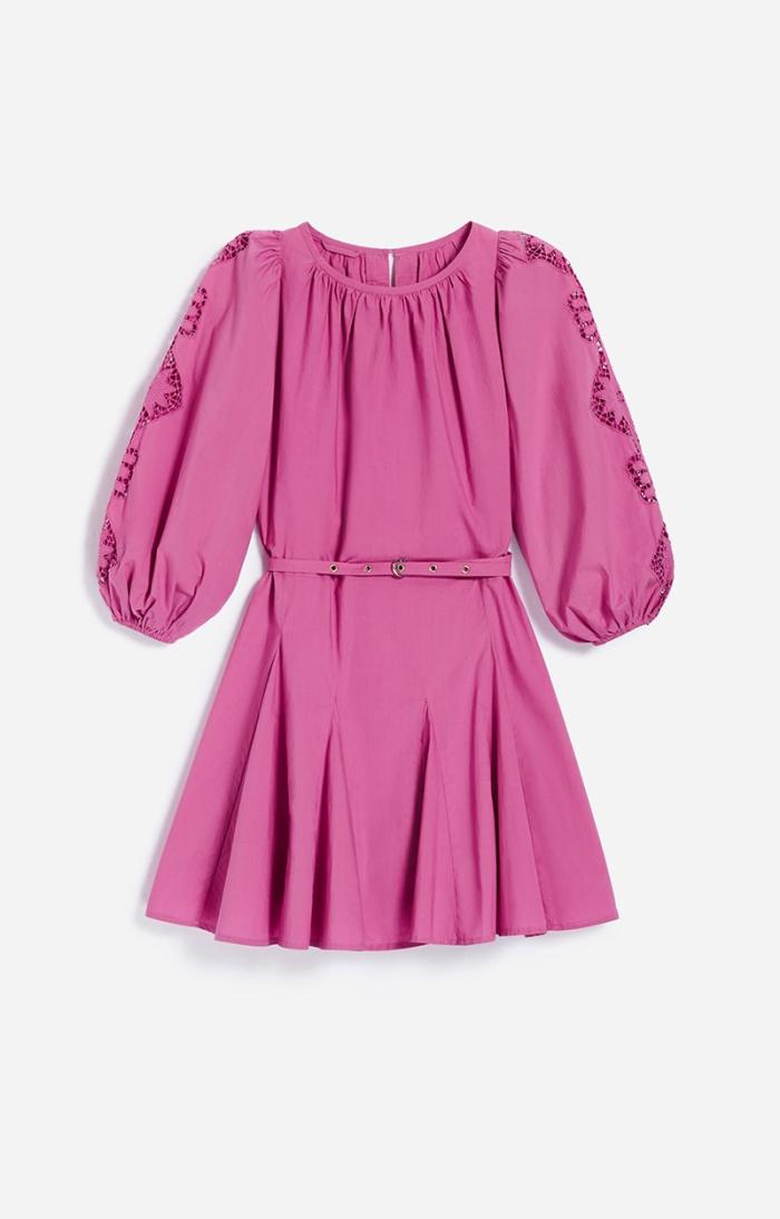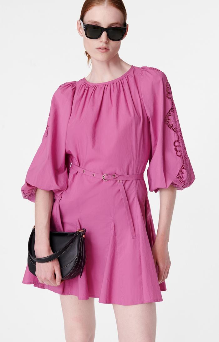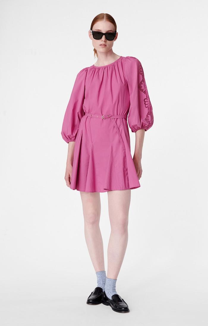This baby doll-style piece is made from cotton and features subtly puffed sleeves adorned with embroidery. Lightweight and playful with a gathered collar, it slips on in a flash for a chic, casual look. It can be worn with or without its fabric belt.