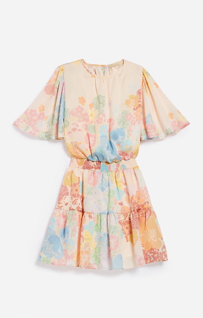 This short, ruffled dress, with its smocked belt at the waist, is a real joy. To be worn high-waisted, this floaty floral piece will add a touch of imagination to your wardrobe.