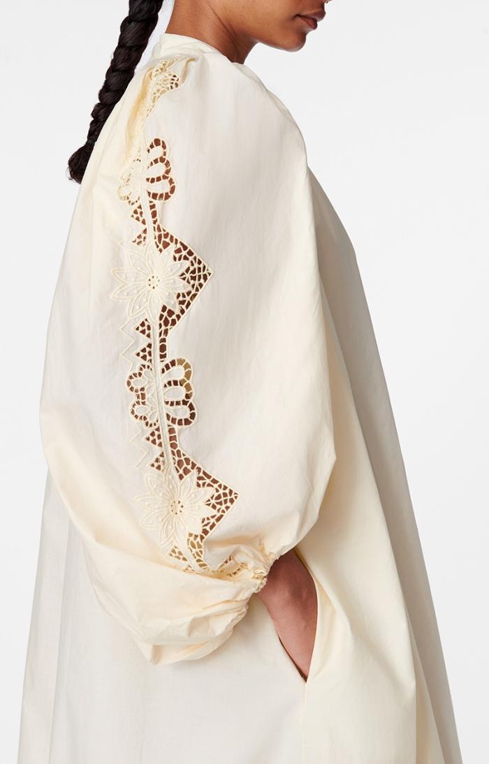 Openwork embroidery on the sleeves and hem.