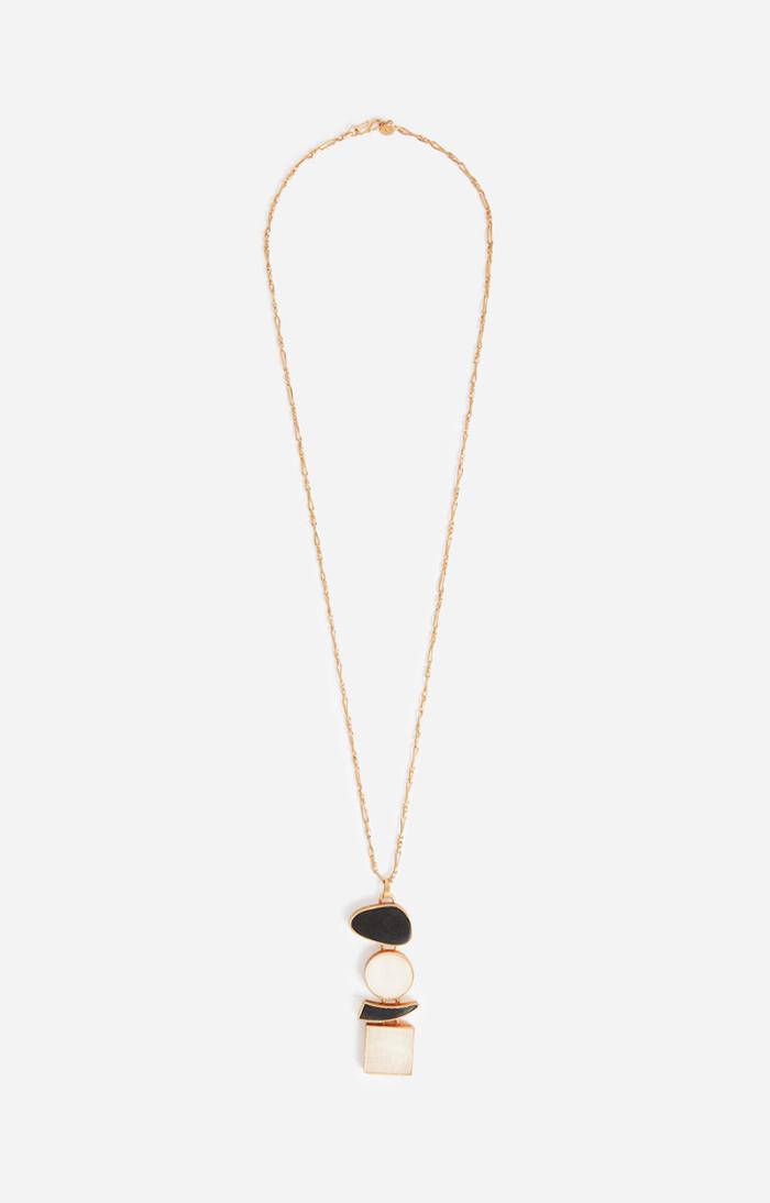 Long brass necklace with black and white articulated stones.
