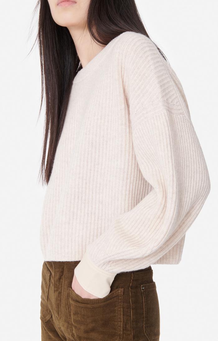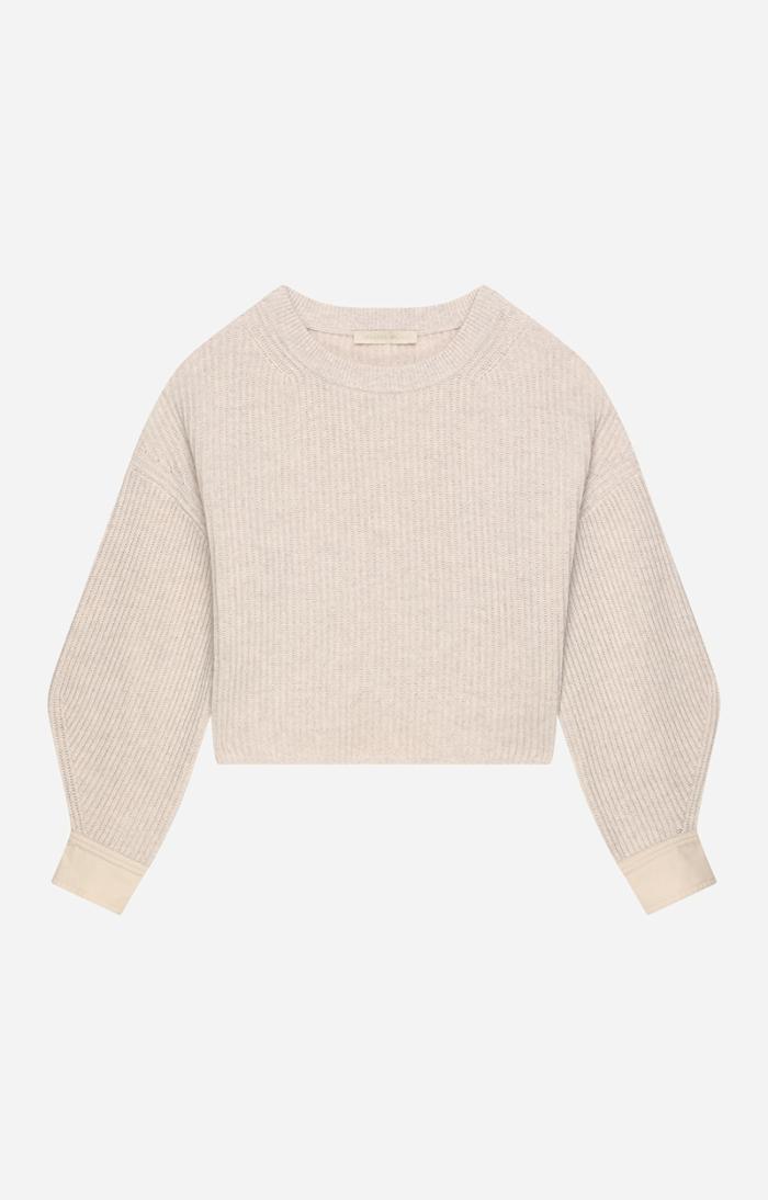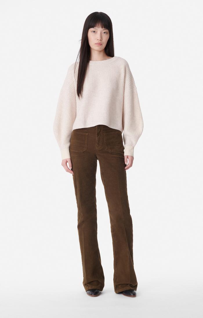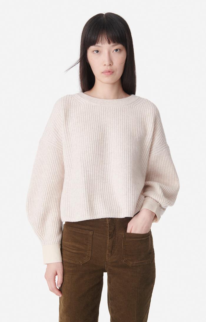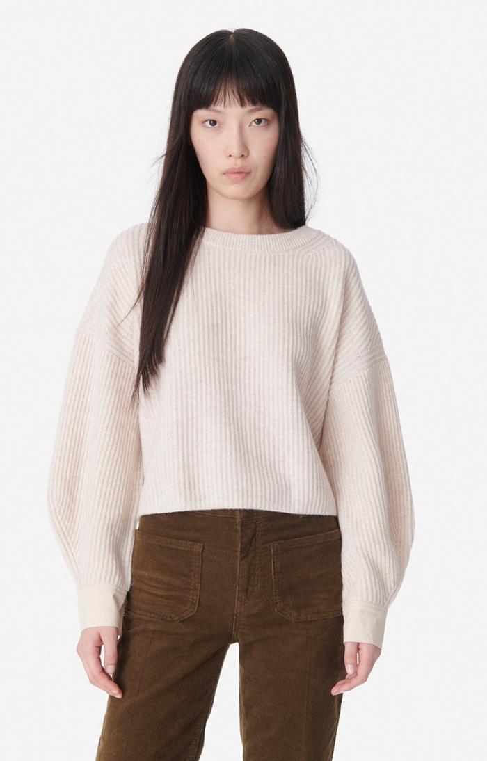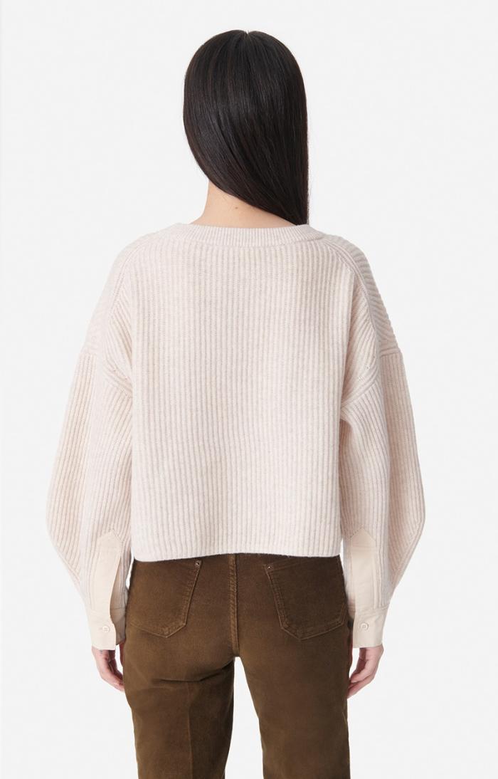 In 100% merino wool with brioche ribbing, stockinette stitch cuffs, mother-of-pearl button, cropped with very wide sleeves. Merino wool jumper.