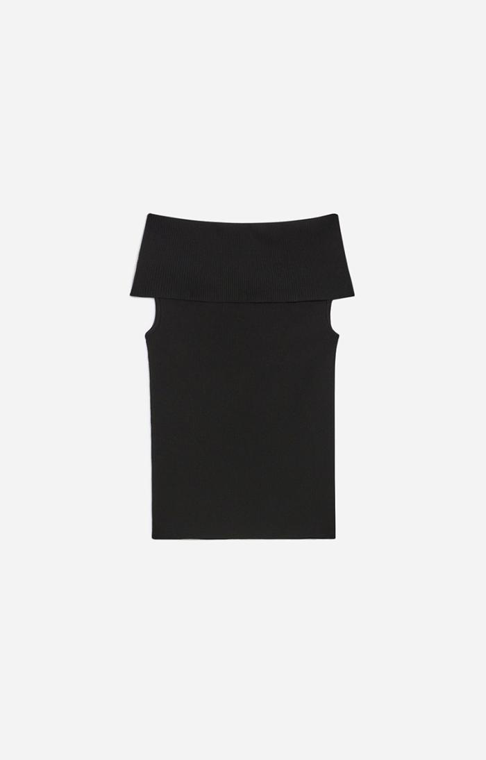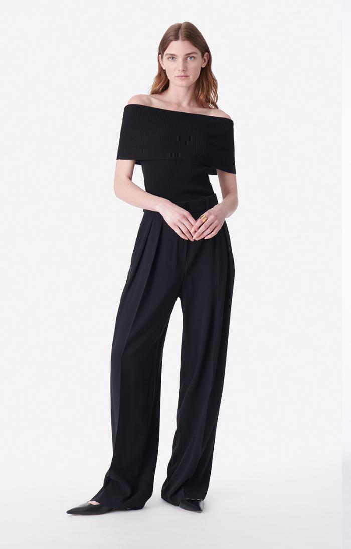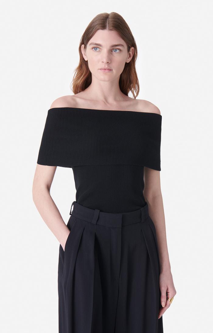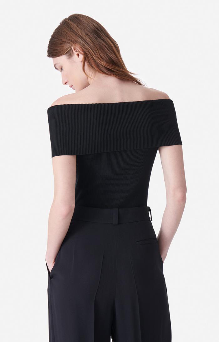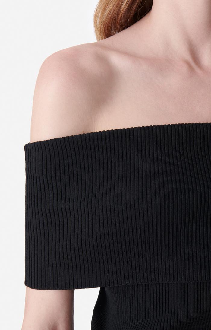 Elegant, sensual and modern, the Bassma top is the trend for Autumn/Winter 2023. Close-fitting, with a wide Bardot neckline, the shoulders are left delicately bare. Wear it with the Bess skirt for a monochrome black look or with jeans.