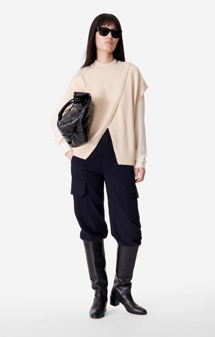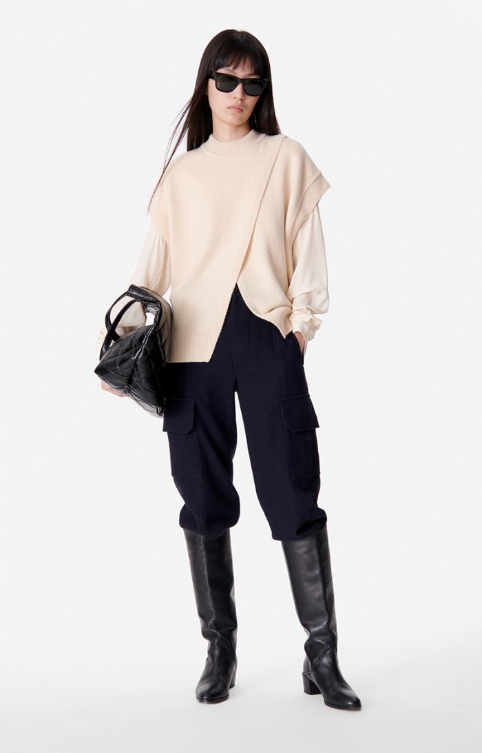 Halfway between a cardigan and a sleeveless jumper, Belina is new for Autumn/Winter 2023. Use a layering technique with this piece by layering it over a blouse.