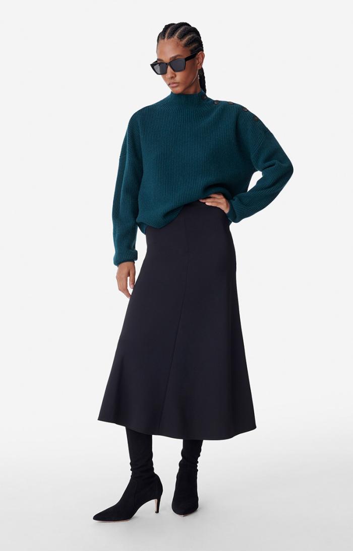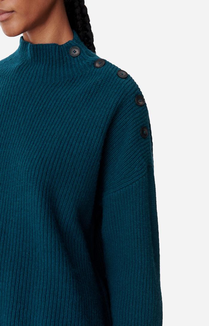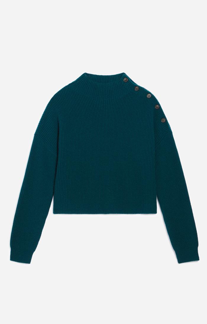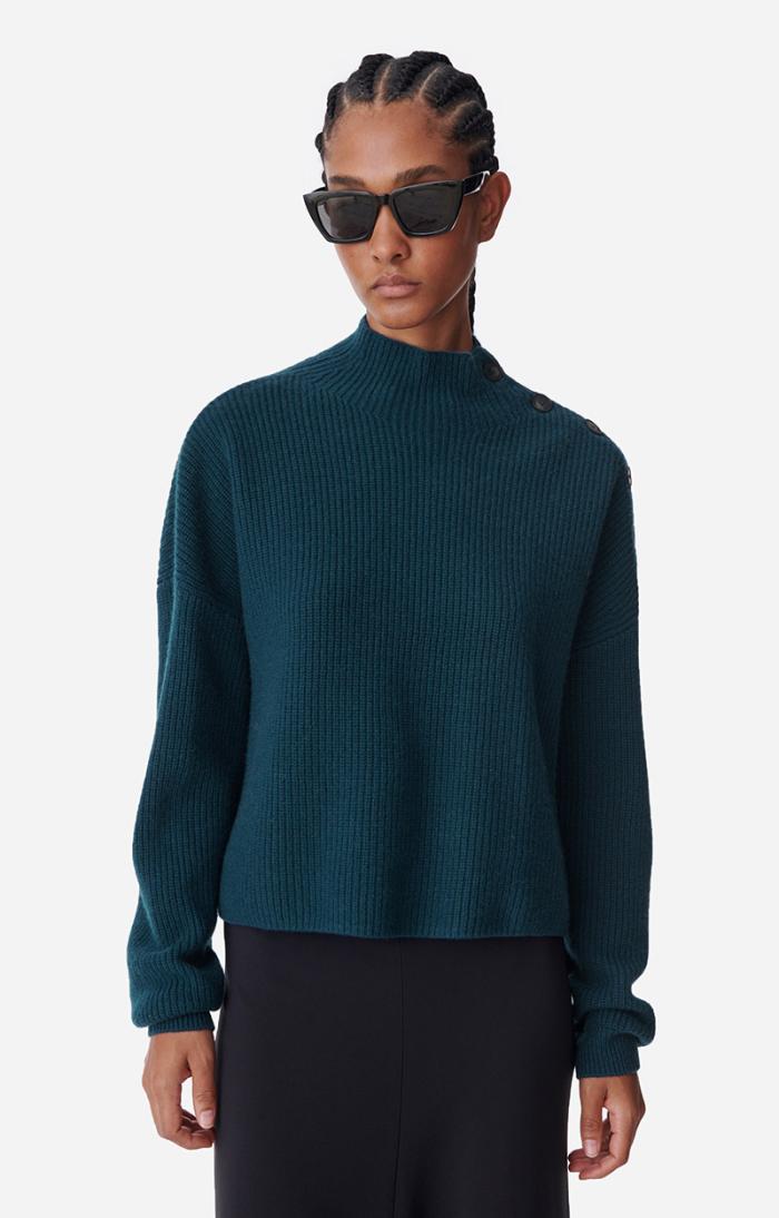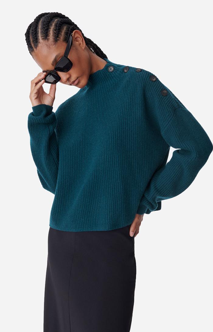 Vanessa has always loved these soft everyday jumpers, exuding femininity. Made in a blend of merino and yak, this piece will keep you warm while remaining chic with its horned buttons on a slightly dropped shoulder. The Benson jumper is subtly oversized, with a boxy line that can be worn under a dress or over body-hugging bottoms.