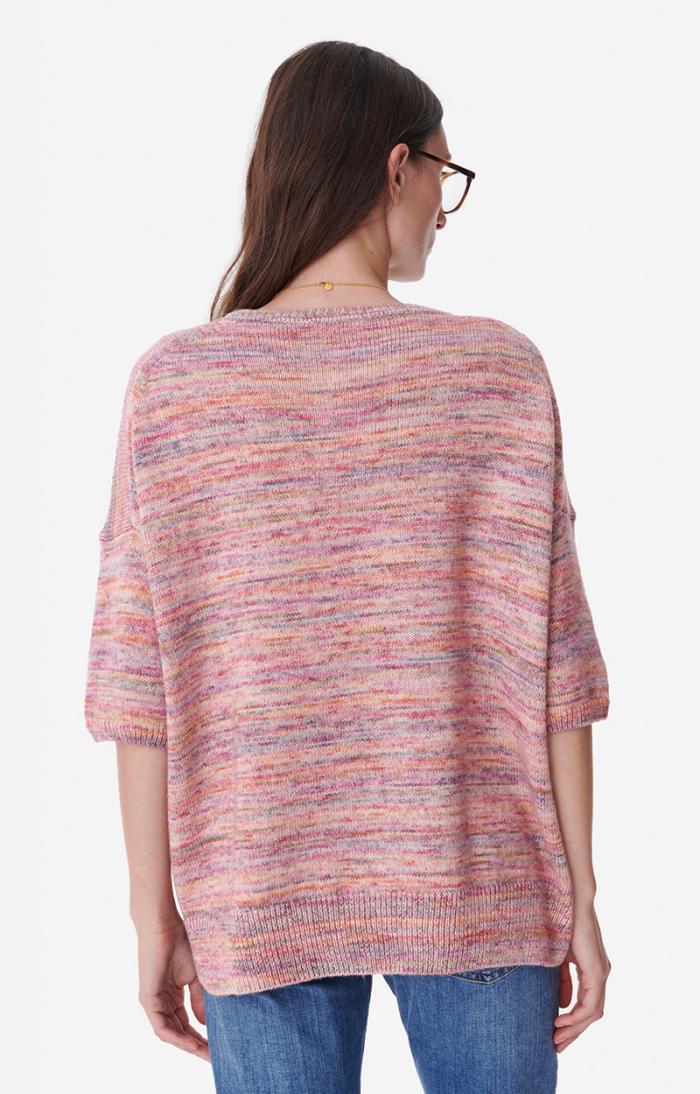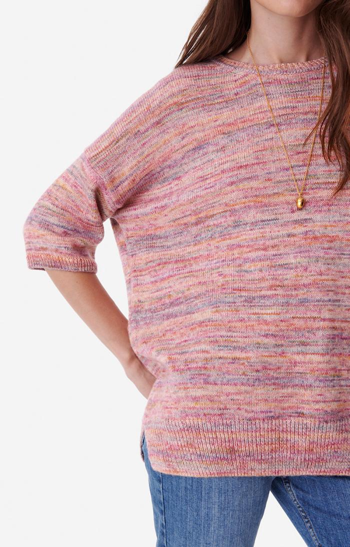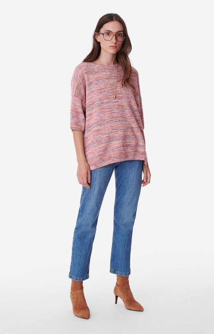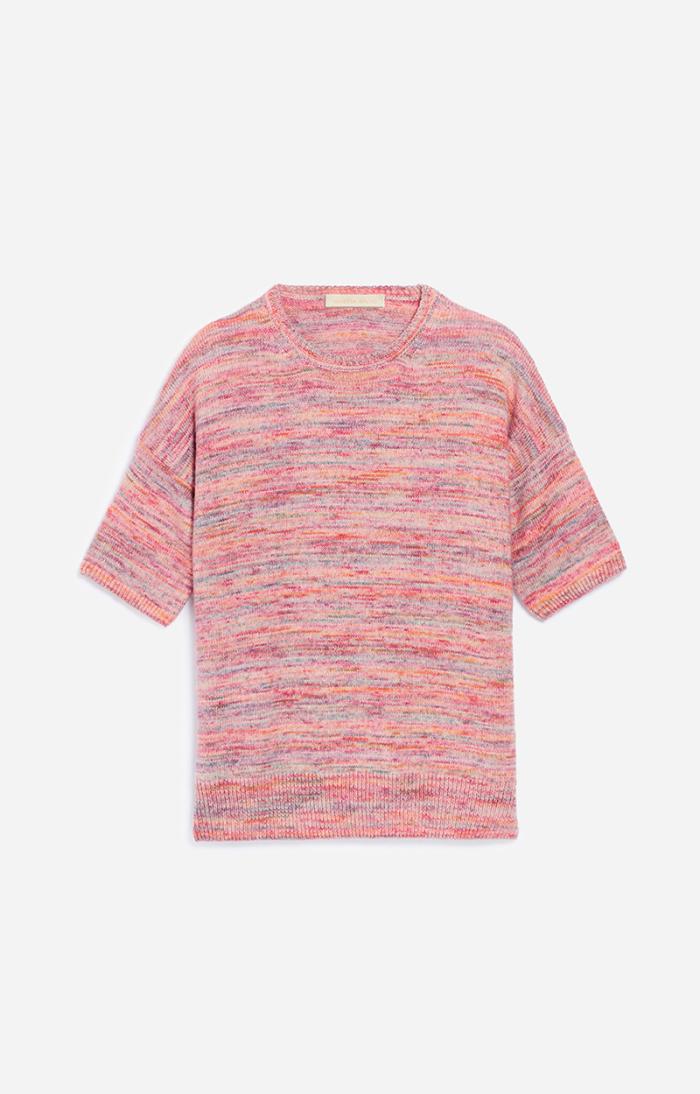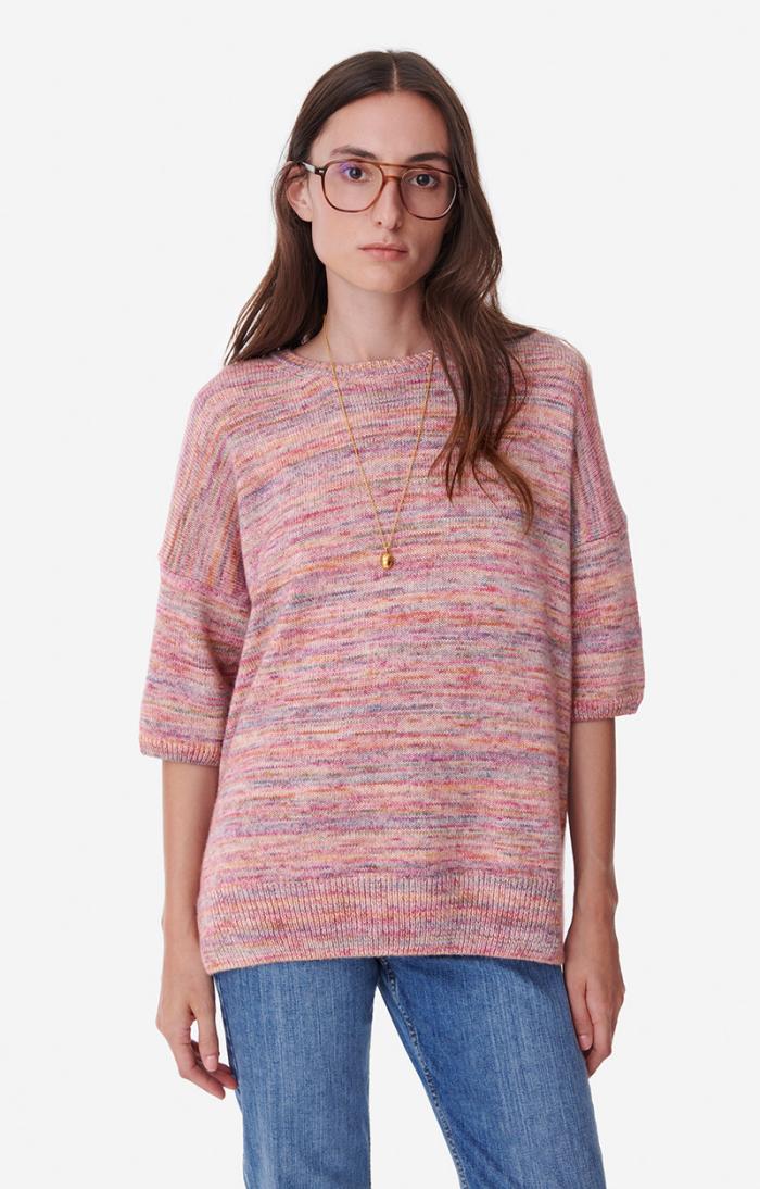 The Bianca jumper is a new addition to the Autumn/Winter 2023 collection and is made from a printed yarn in powder pink hues. Cut in a T-shirt style with drop shoulders, this body-hugging design stands out for its rich composition, a blend of cotton, baby alpaca and wool. To brighten up any wardrobe.