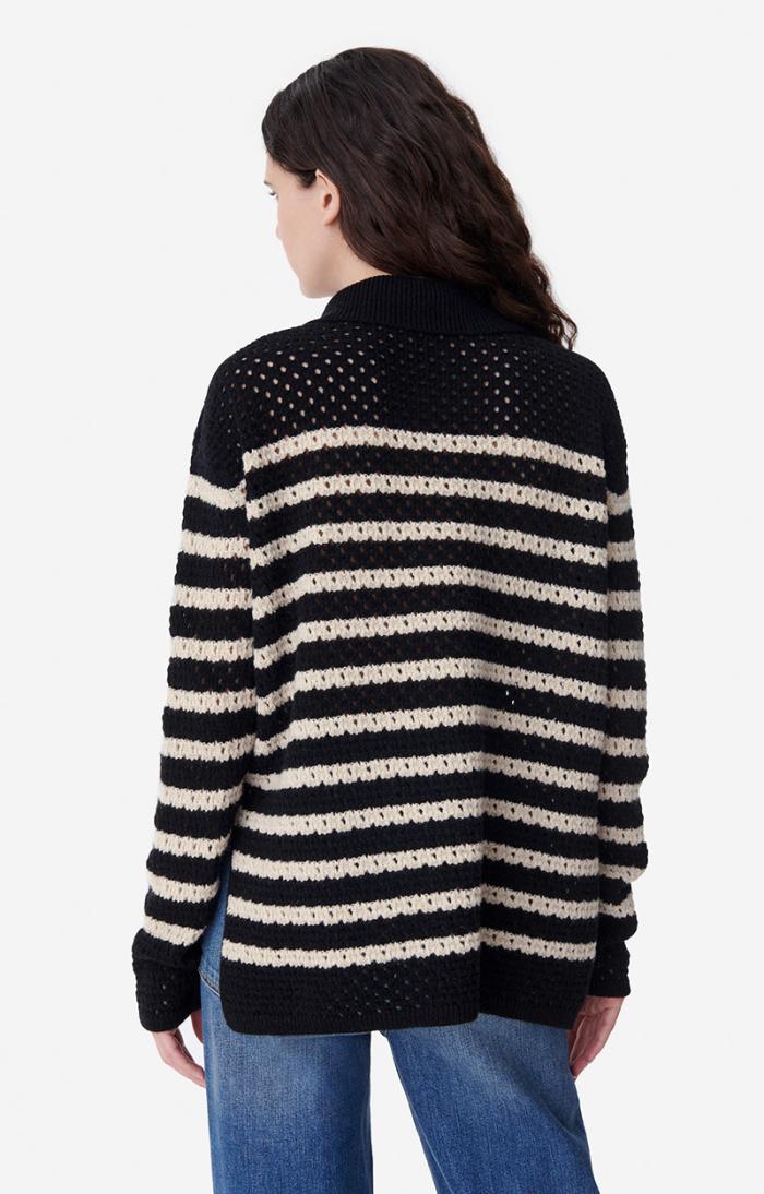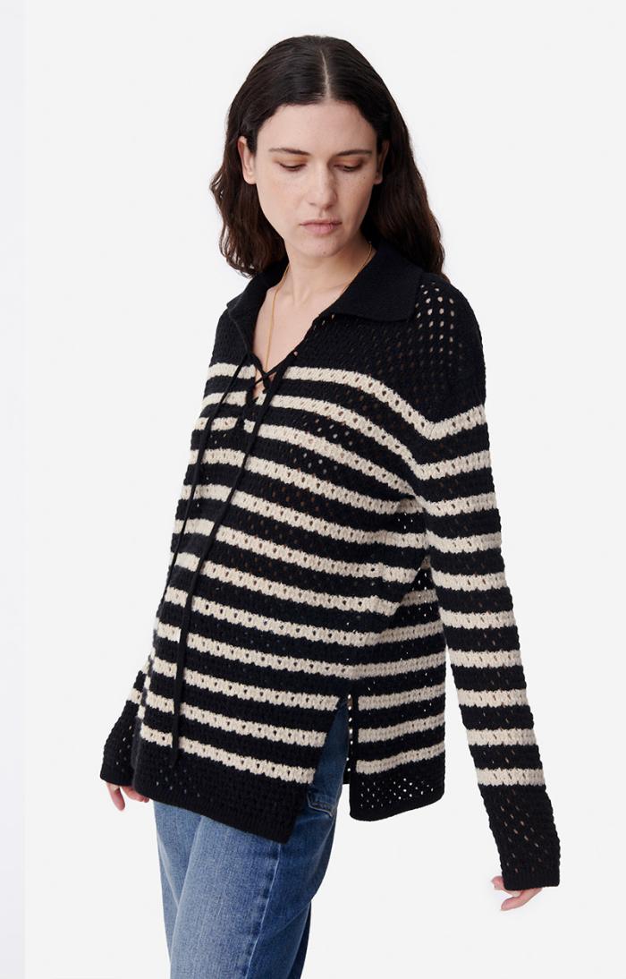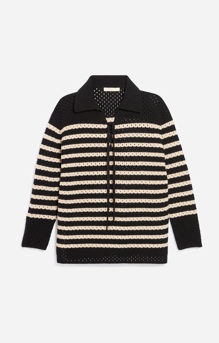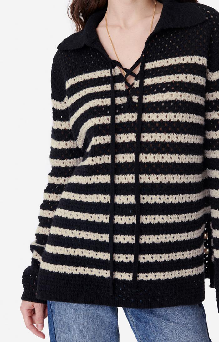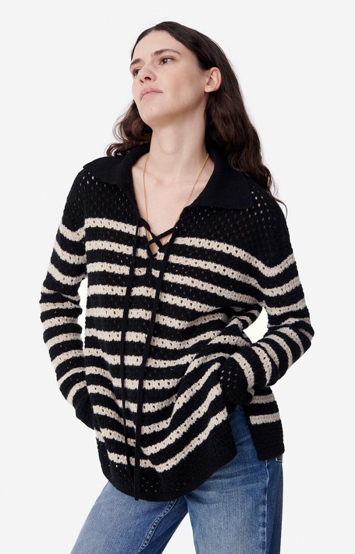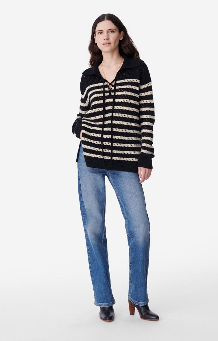 The Britney jumper, new for Autumn/Winter 2023, revisits the classic Breton jumper. This piece stands out with its openwork stitching and V-neck ties. Made in a wool blend, this long, straight design can be worn with jeans or a short skirt.