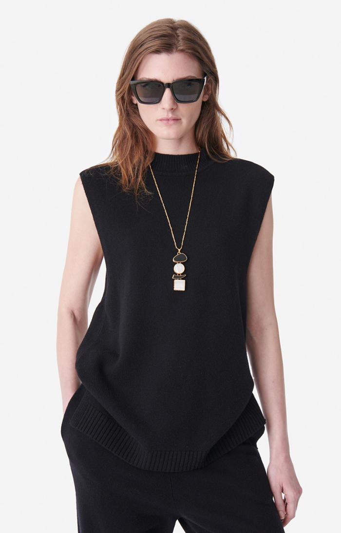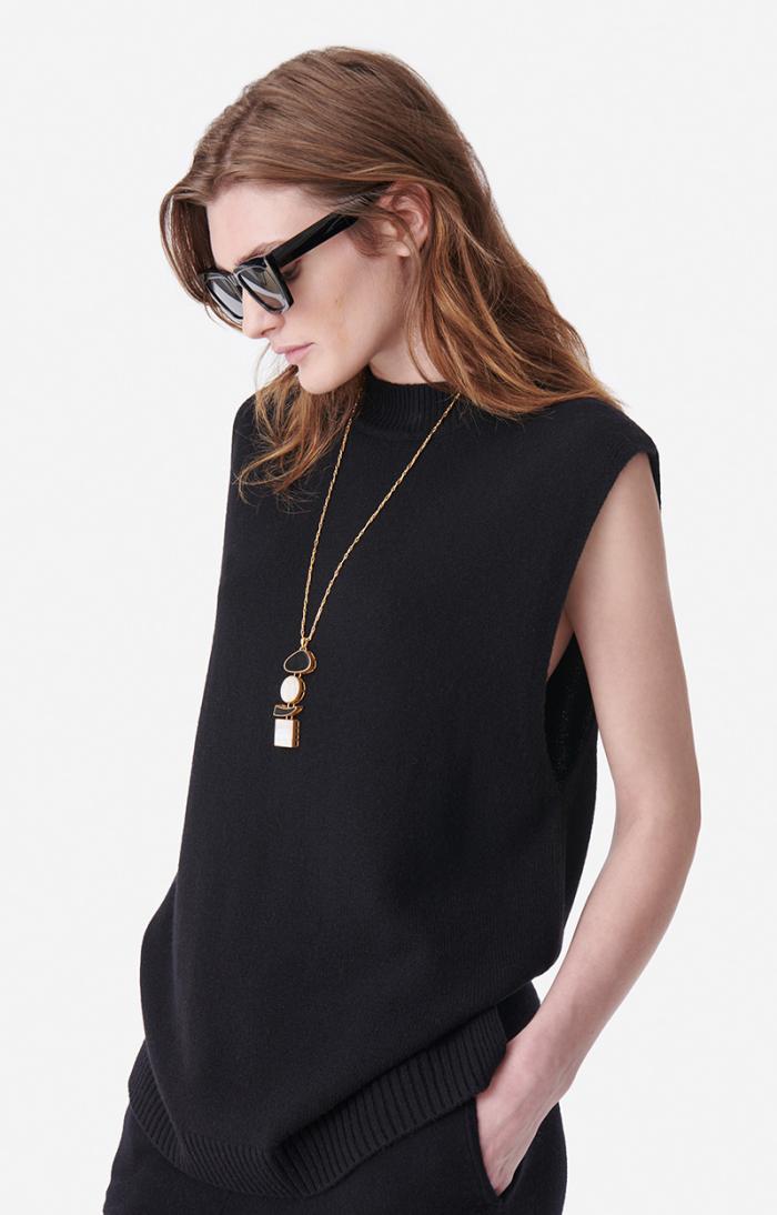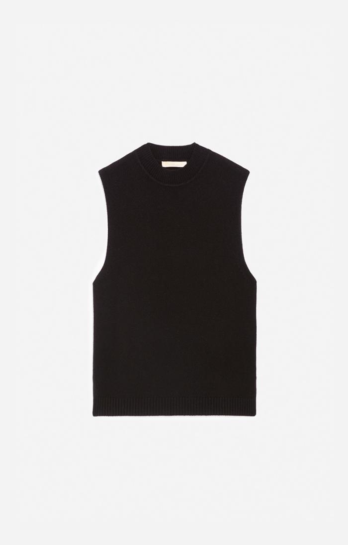 Made from a merino wool blend, this model stands out for its sleeveless cut and high collar. With its wide armholes, this jumper is designed to be worn over an under-sweater or a blouse with full sleeves, for an effortlessly chic layering effect.