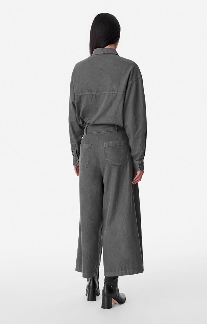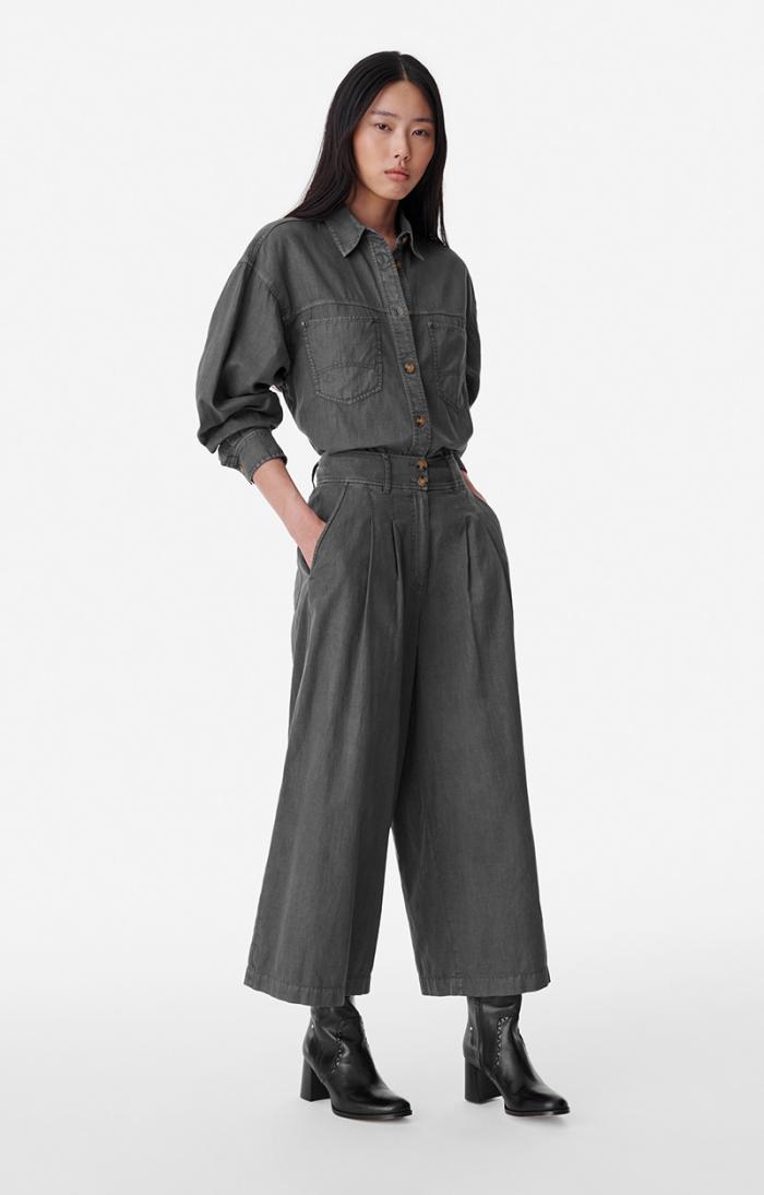 Halfway between wide-leg trousers and culottes, the Banjo jeans are new for Autumn/Winter 2023. These raw denim, high-waisted cropped jeans feature generous pleats. We love wearing them with boots or with a denim shirt and jacket for a cowboy look.