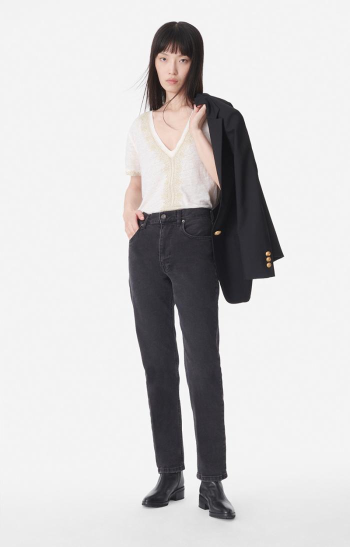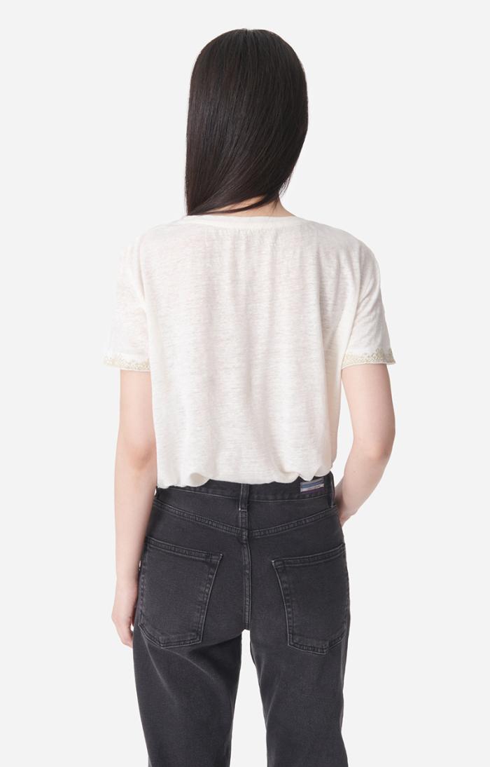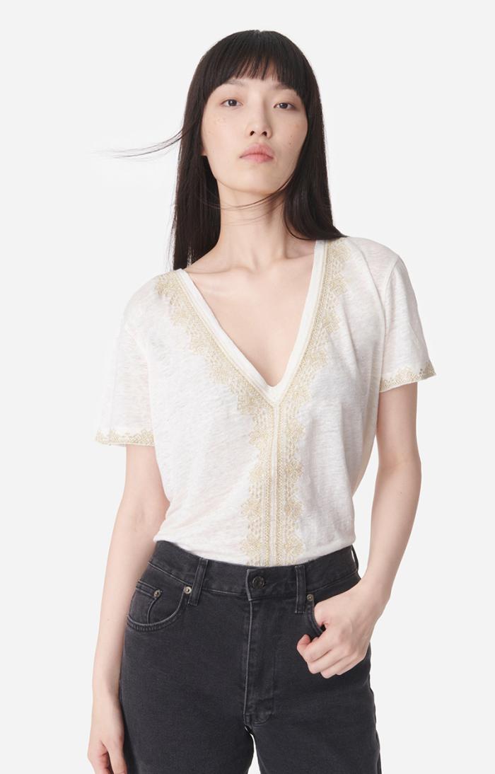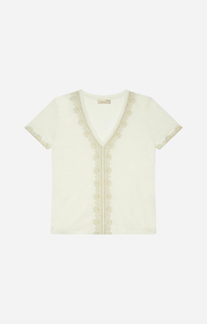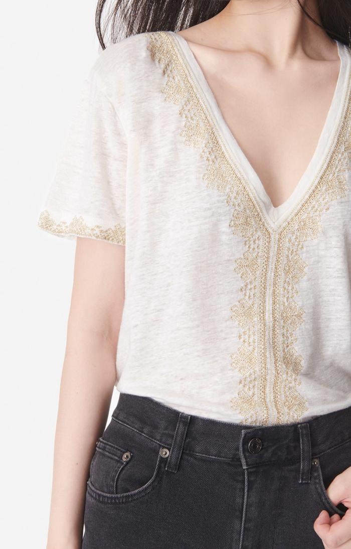 Simple yet elegant, the Amaya top is the perfect summer essential. Made in a light linen, this design stands out with its collar, sleeves and front embroidered with elegant metallic arabesques. Wear it with shorts or simple jeans.