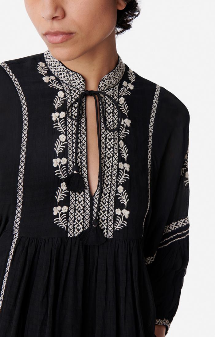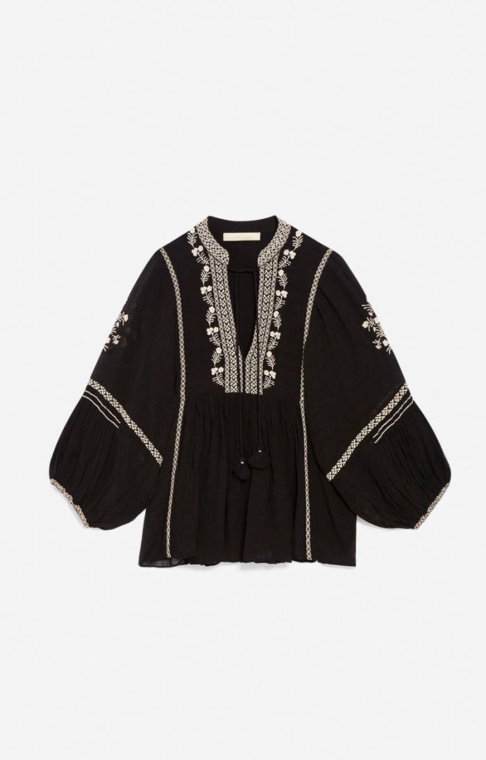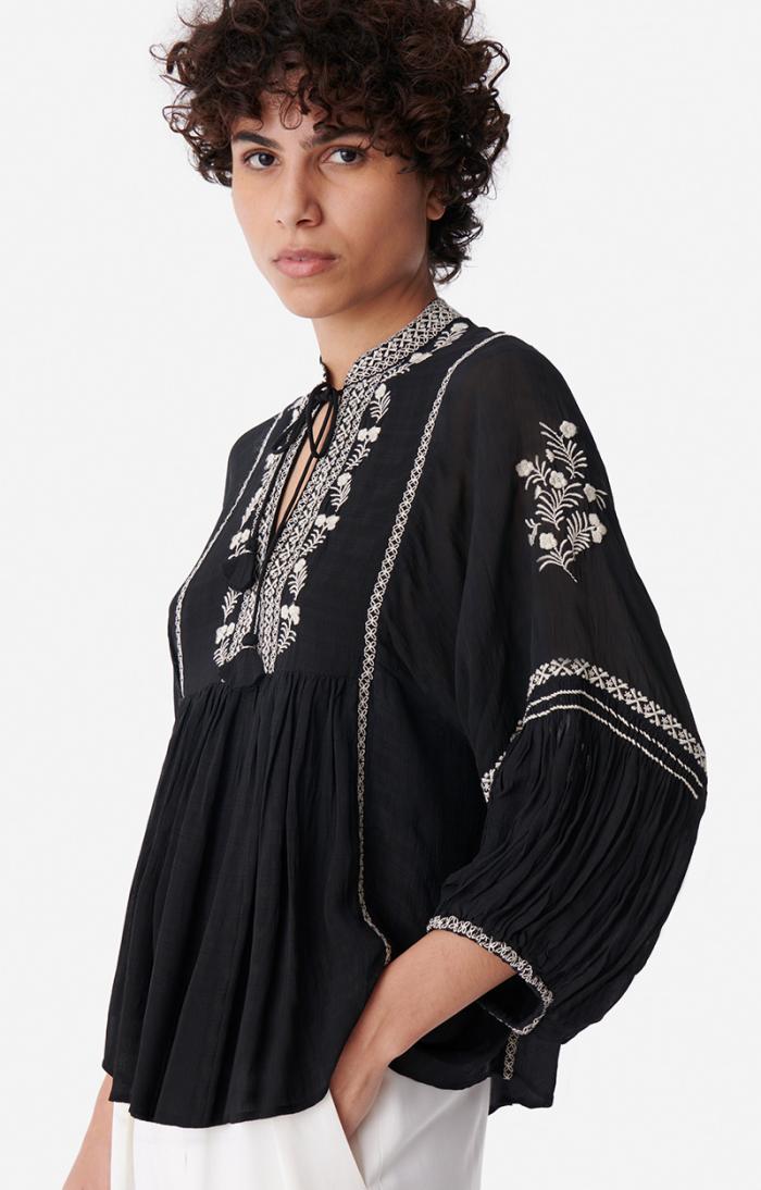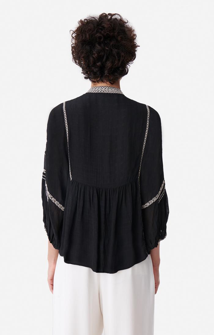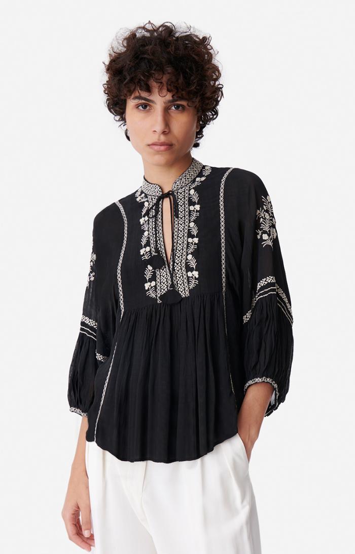 The ultimate bohemian blouse, Baltik has a Tunisian neckline with fine ties featuring tassels and beads, and large puffed sleeves with elasticated cuffs.