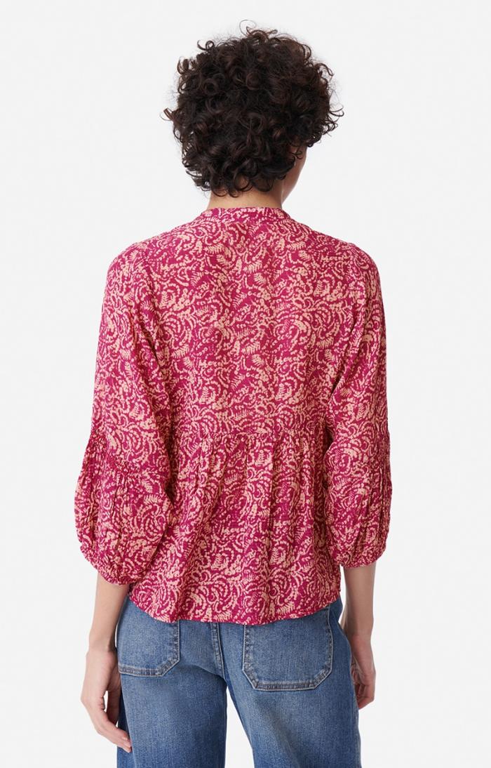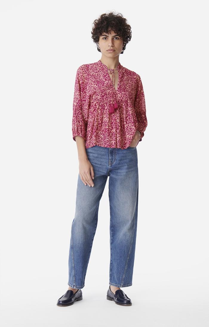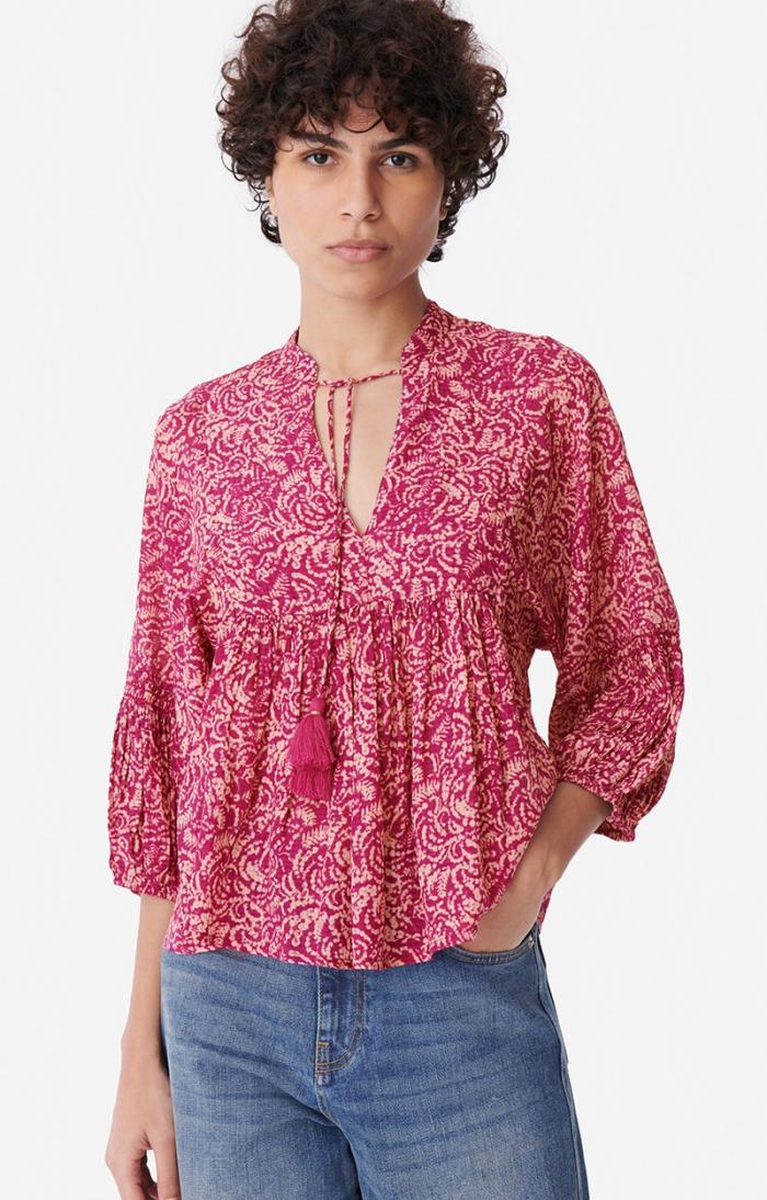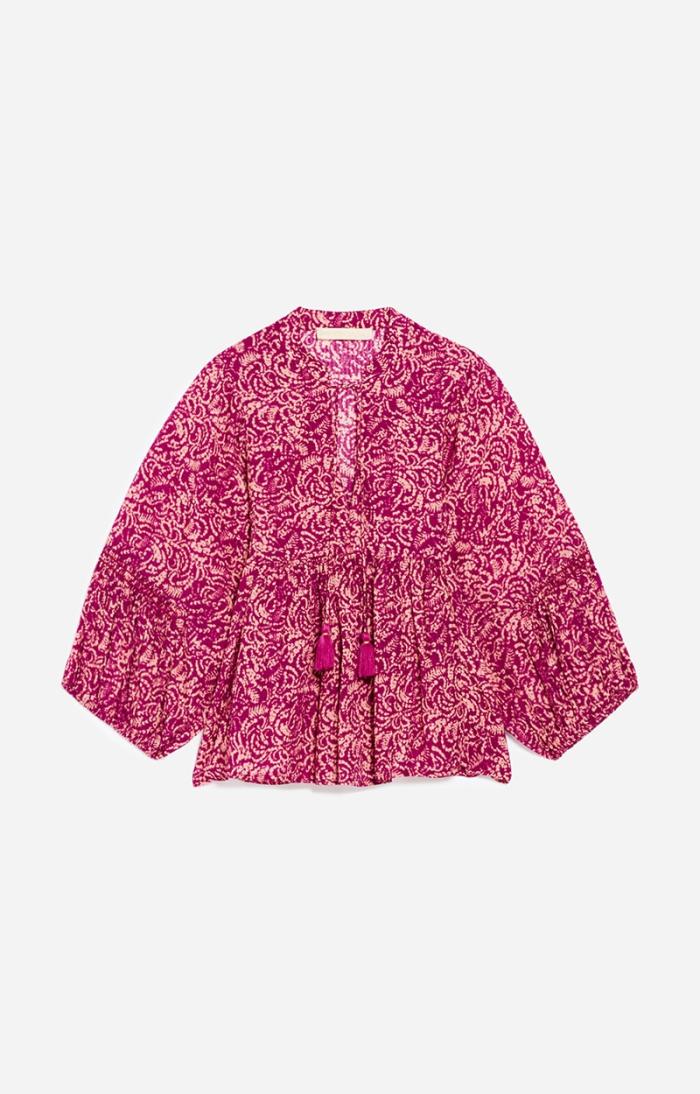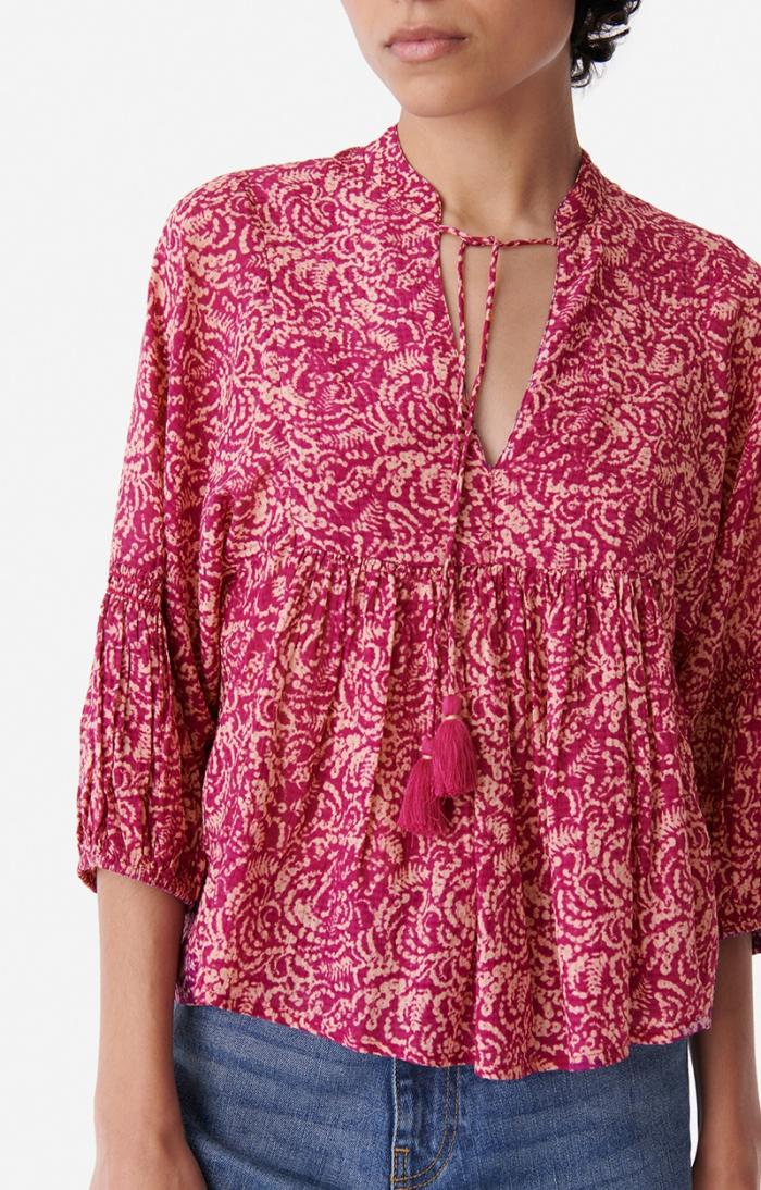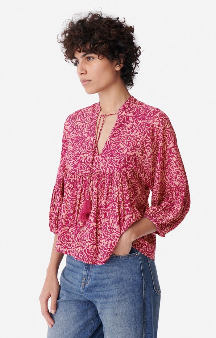 The ultimate bohemian blouse, Baltik has a Tunisian neckline with fine ties and pompoms, and large puffed sleeves thanks to its elasticated hems.