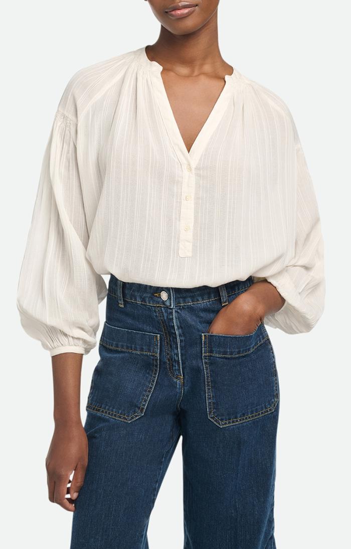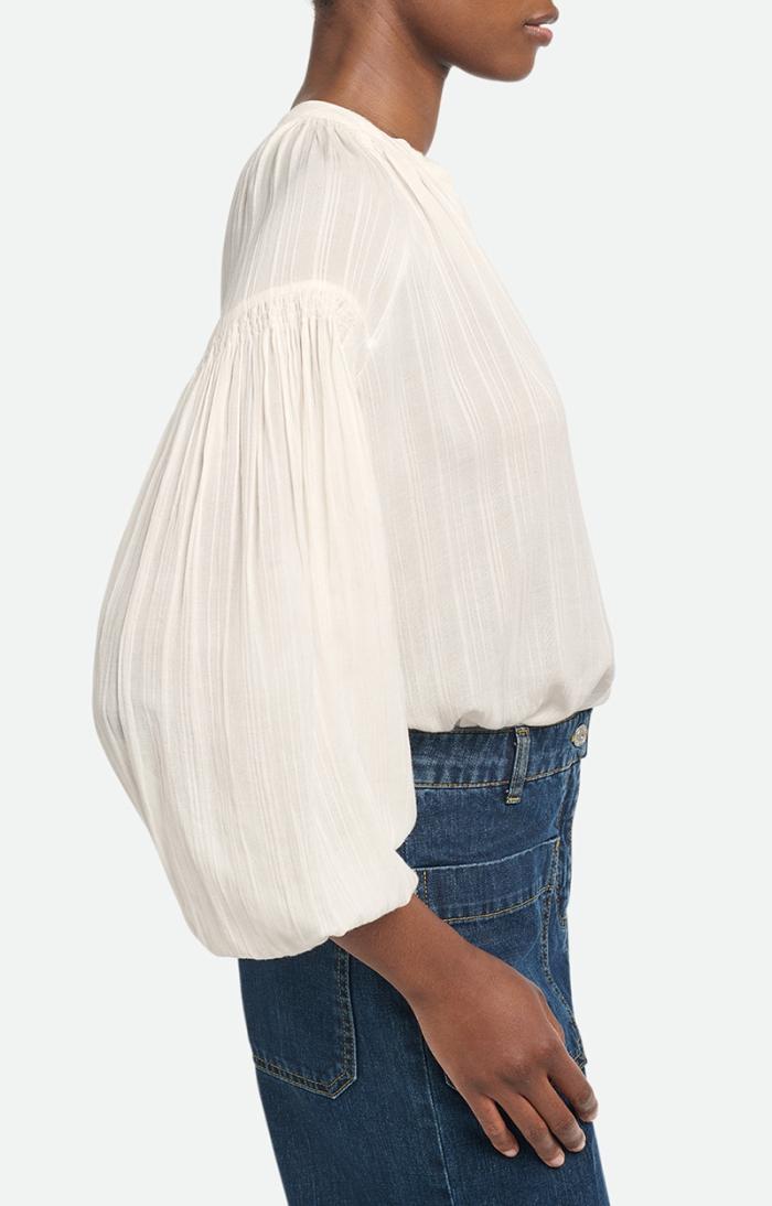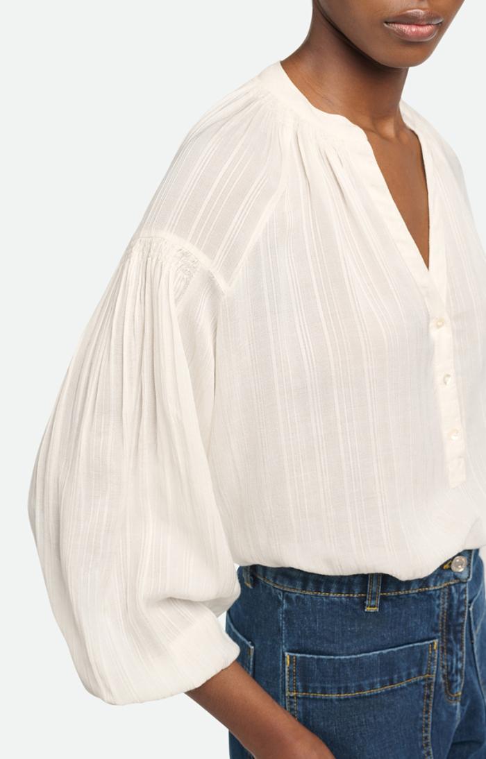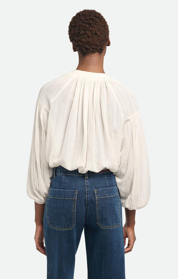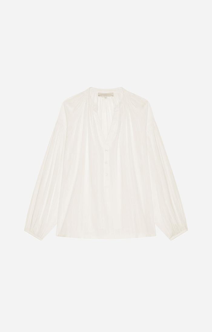 Simplicity and elegance for the Nipoa blouse. This top combines a V-neck and long sleeves. It stands out thanks to its lowered armholes and enhanced by a beautiful play of gathers to bring volume. The buttoned cuffs are embellished with small flat pleats. A blouse with chic details, perfect over trousers or shorts.