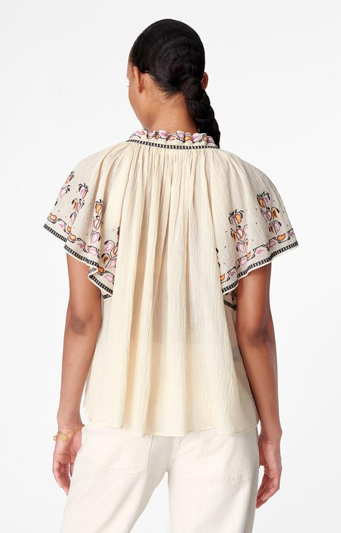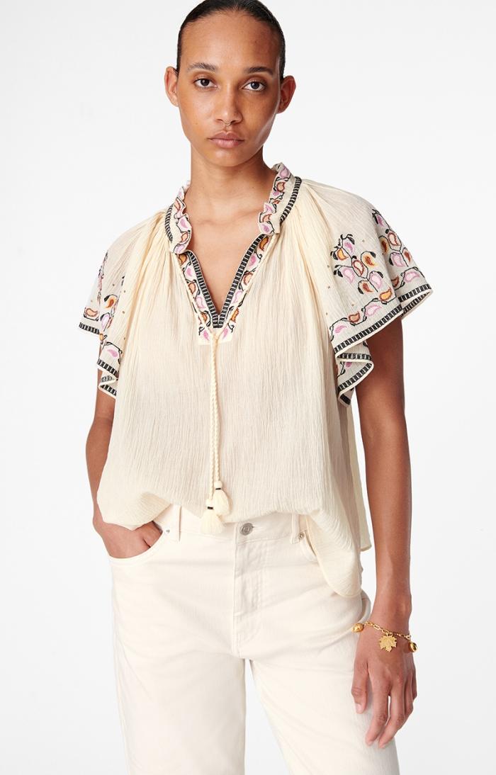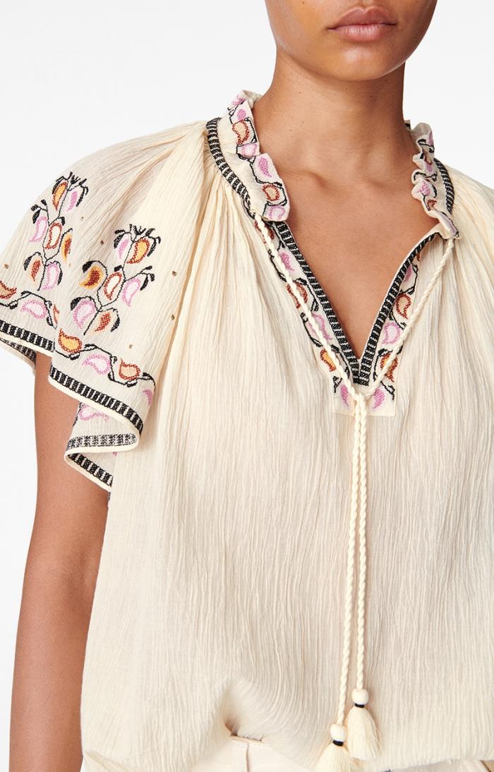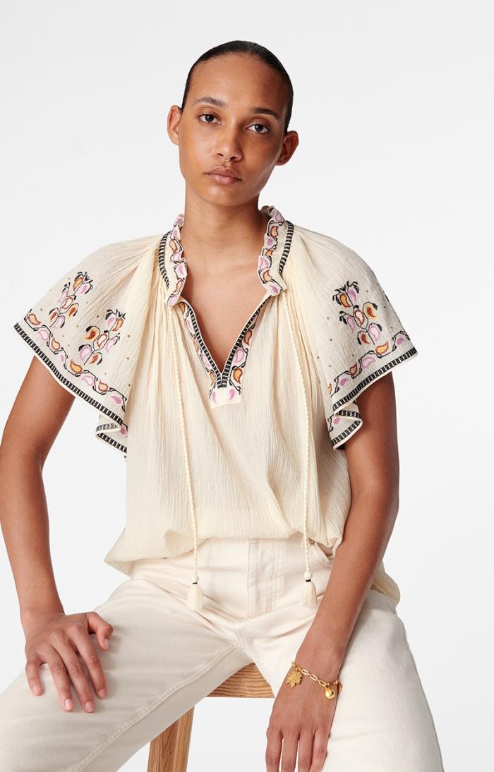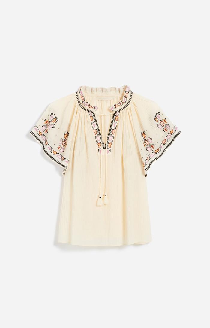 Loose and subtly transparent, the Valentin blouse is perfect for summer. Its Tunisian collar and embroidery are sure to bring a folk style to your outfits. This ruffled piece has a slightly A-line shape and butterfly sleeves for an ultra-summery look.