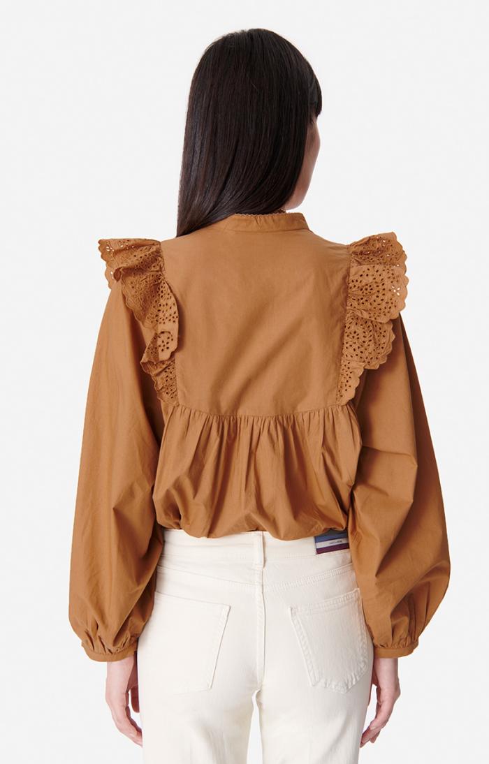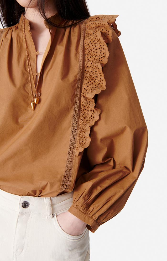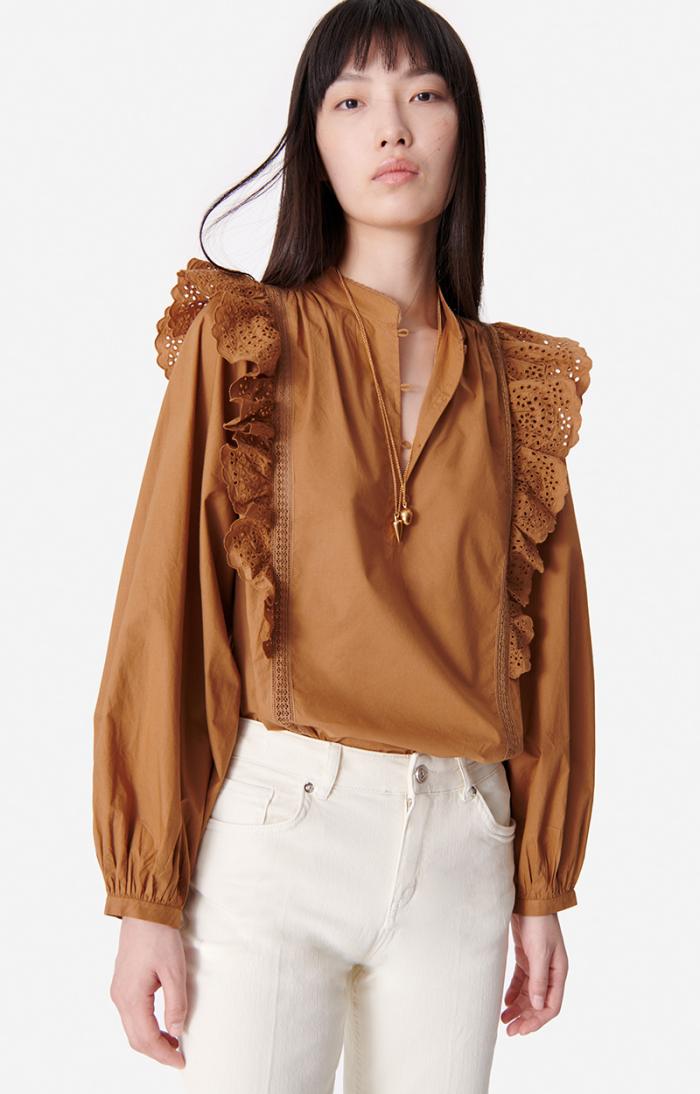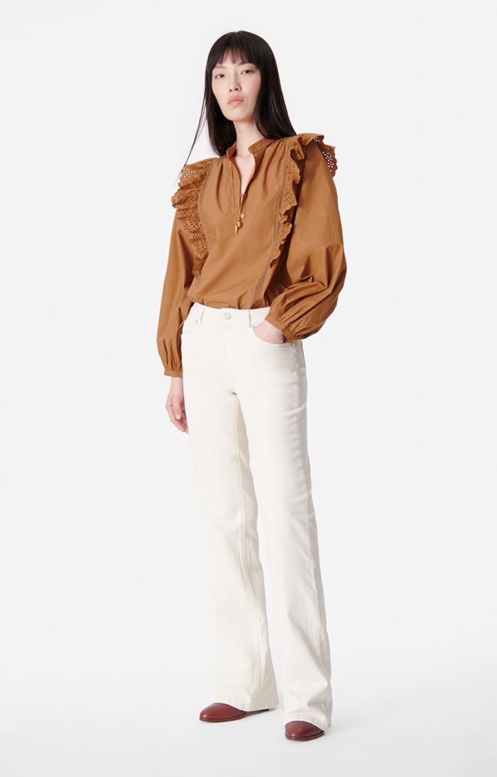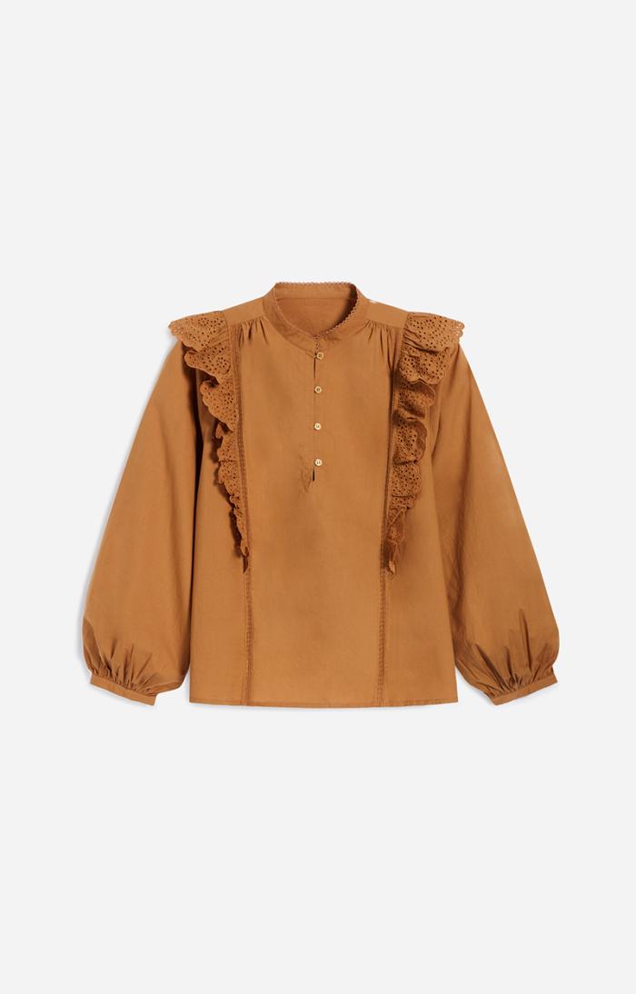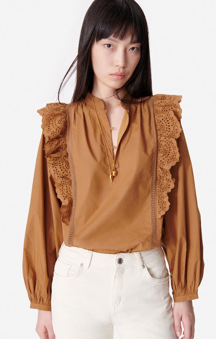 The Vasco blouse plays with Vanessa Bruno’s house style. Chic, romantic and versatile, this cotton blouse stands out for its gathered details and broderie anglaise trim, as well as the lace frills down the front. Wear it with simple jeans or a more formal skirt.