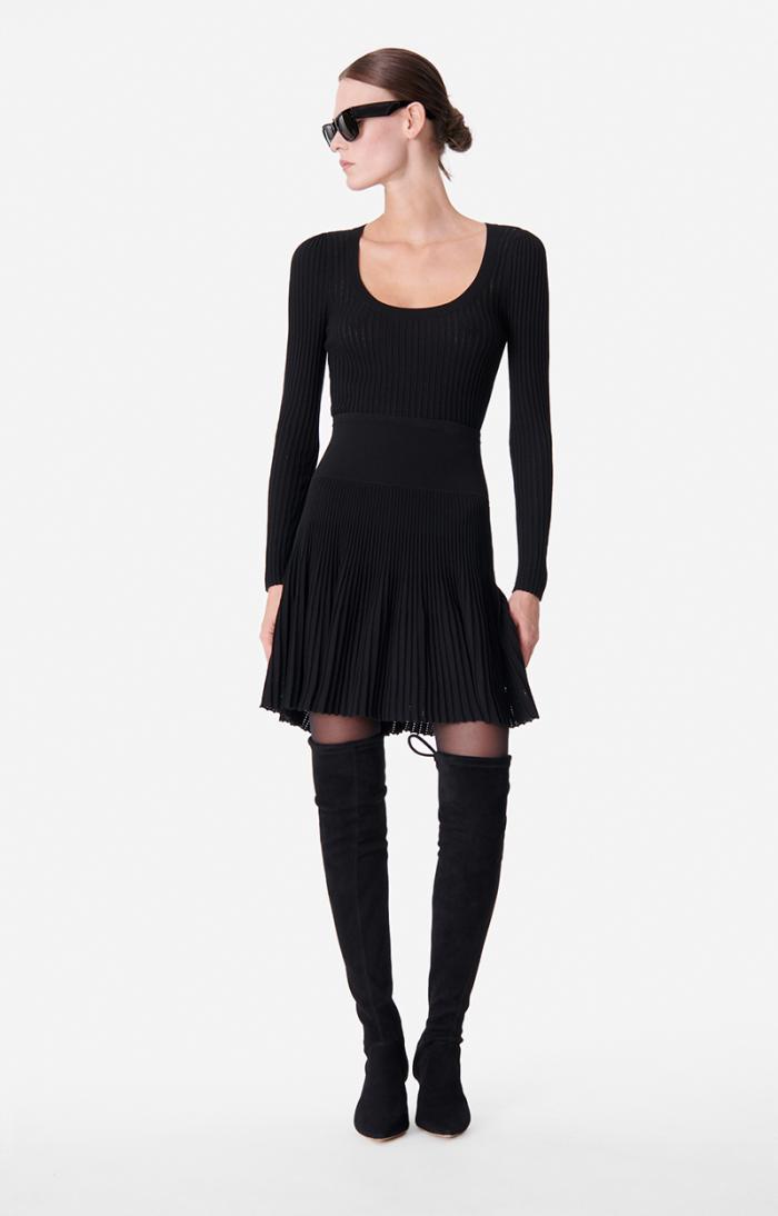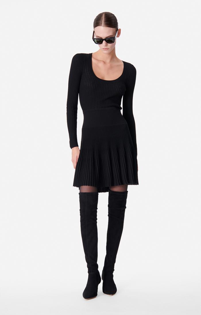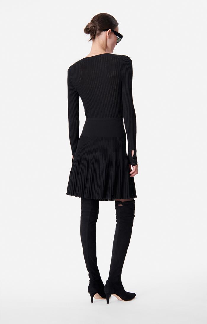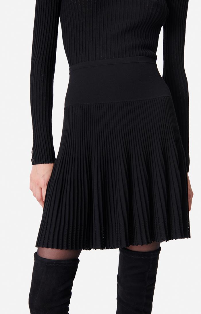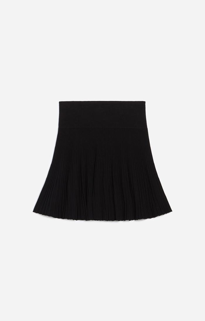 This viscose knit skirt is supple, slim and delicately enhanced with pointelle details at the bottom. The thick elasticated waistband marks the waist. Wear it with a knitted top and blazer to the office.