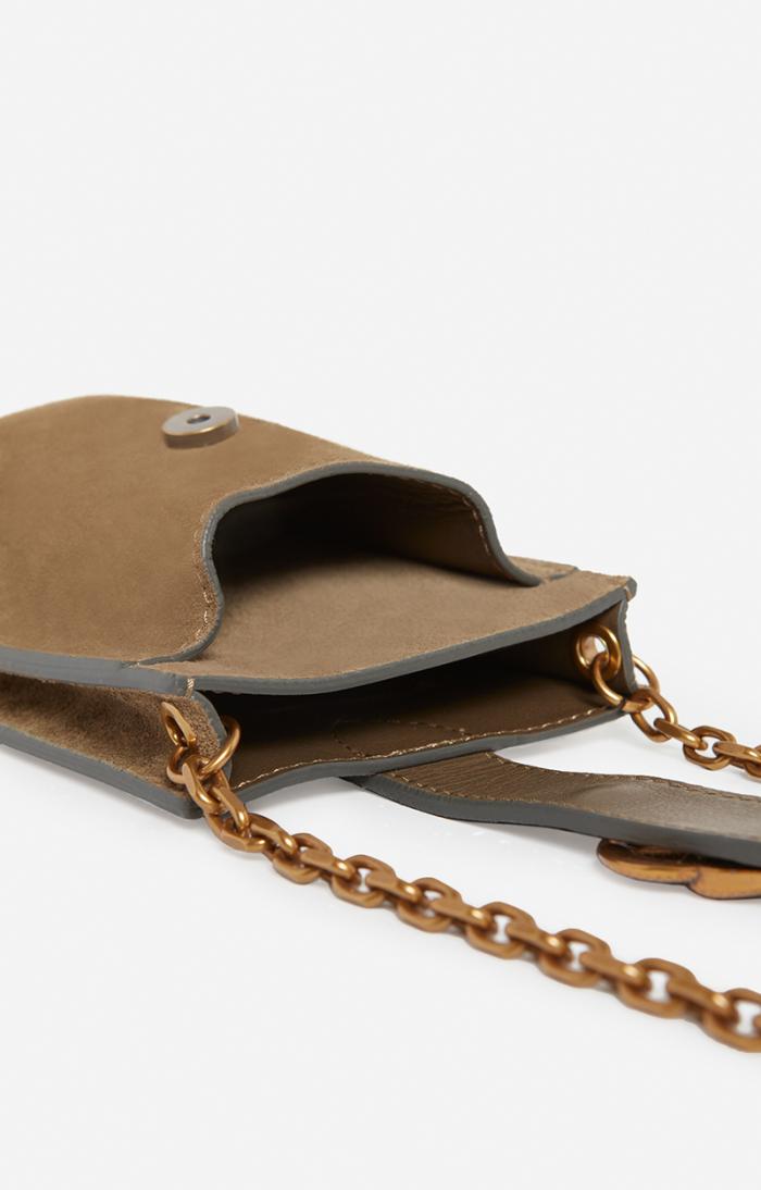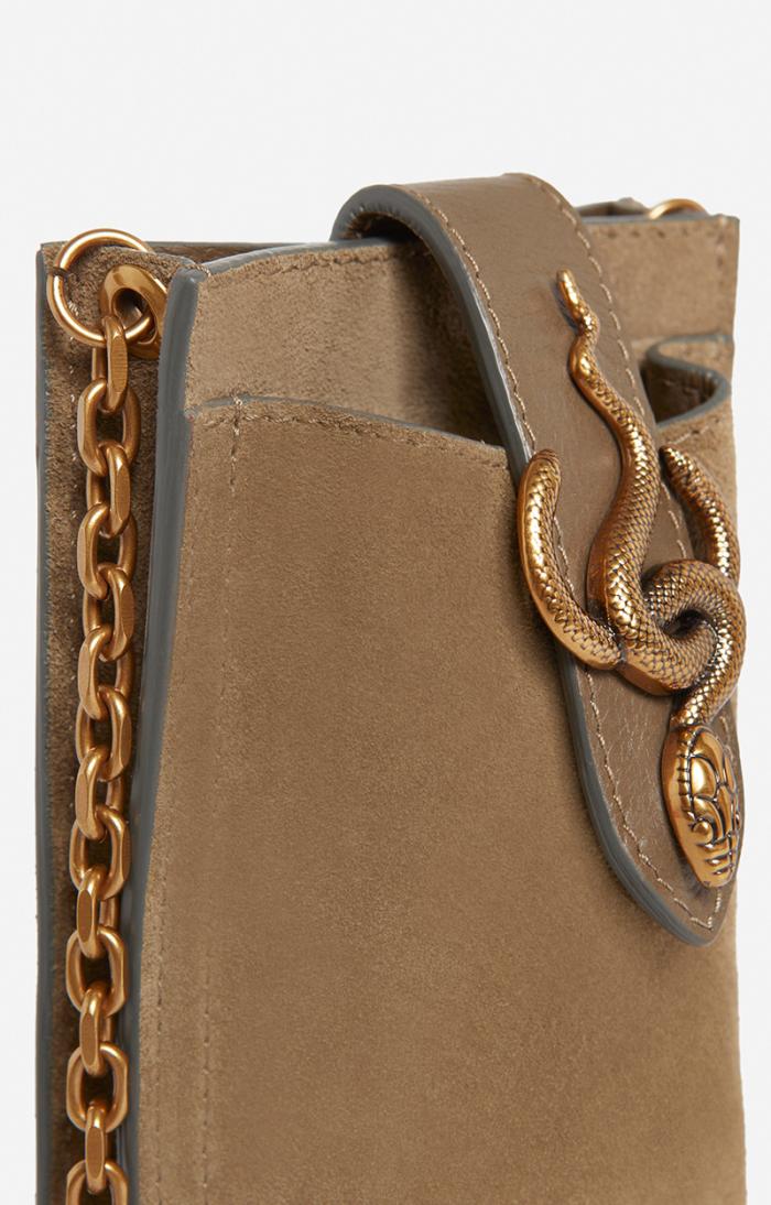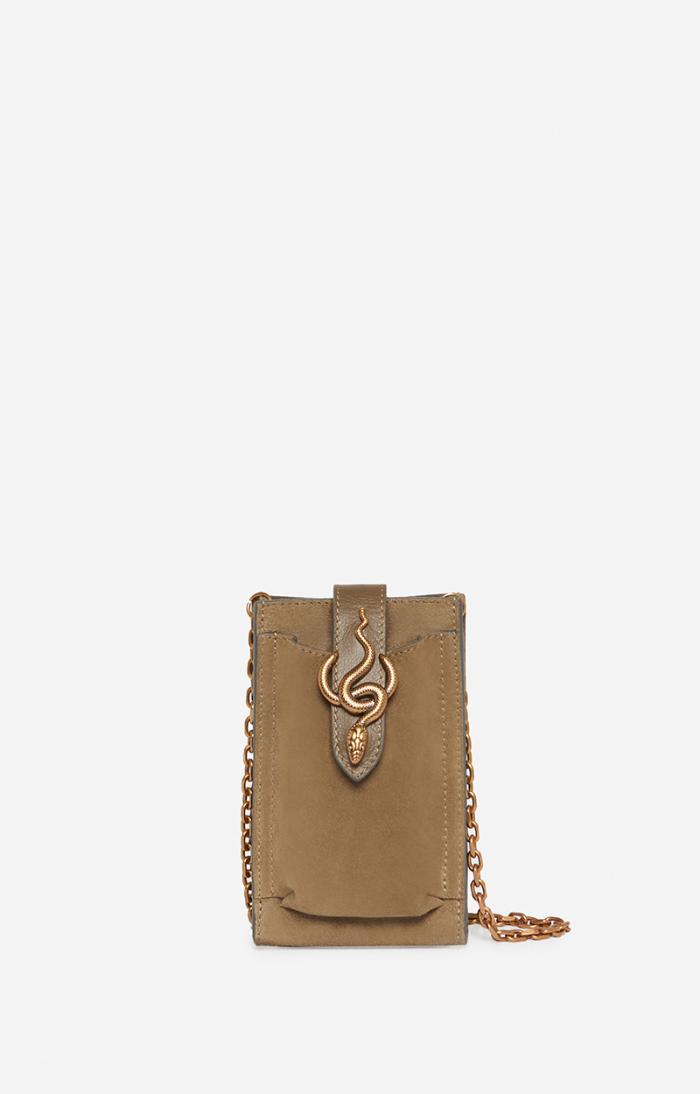Suede phone pouch with snake buckle.